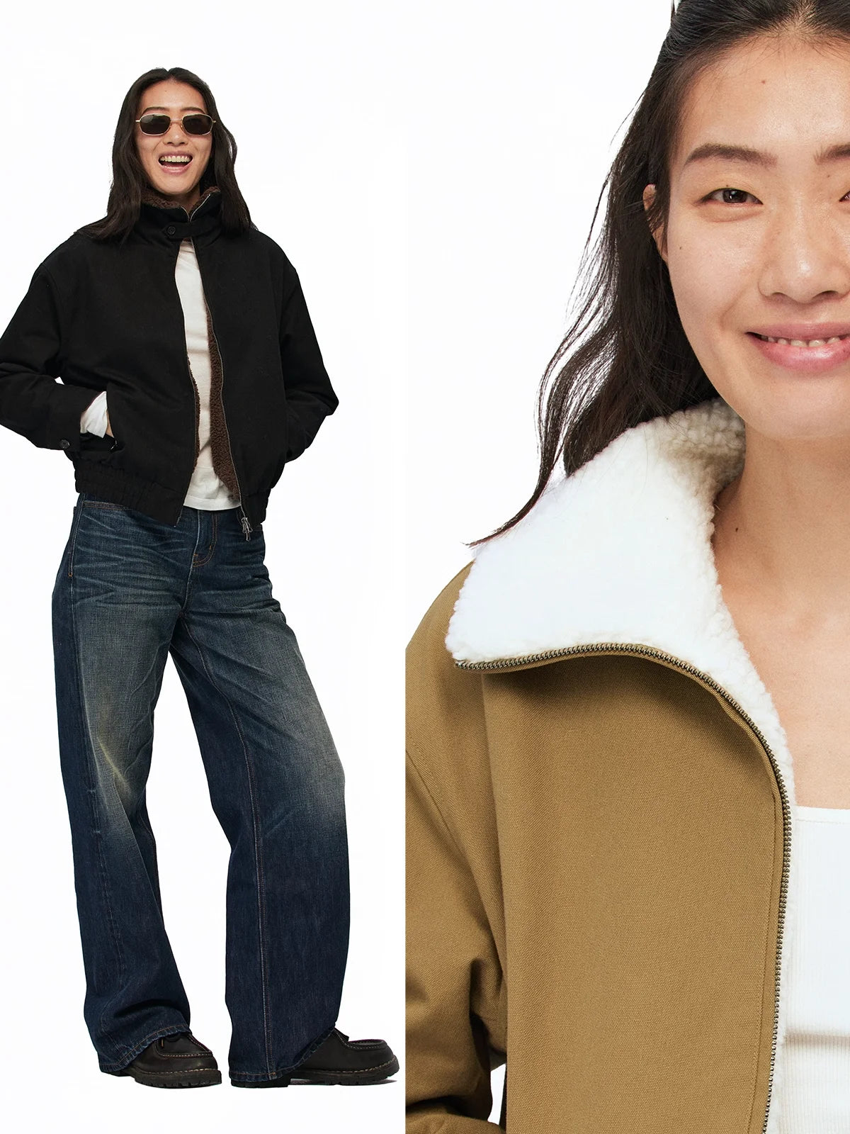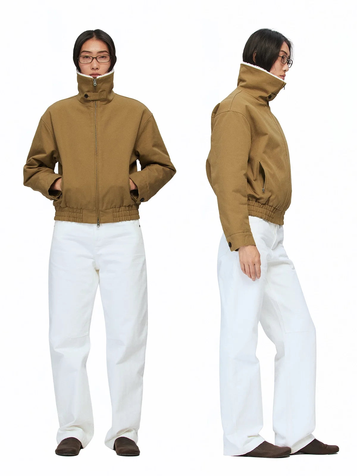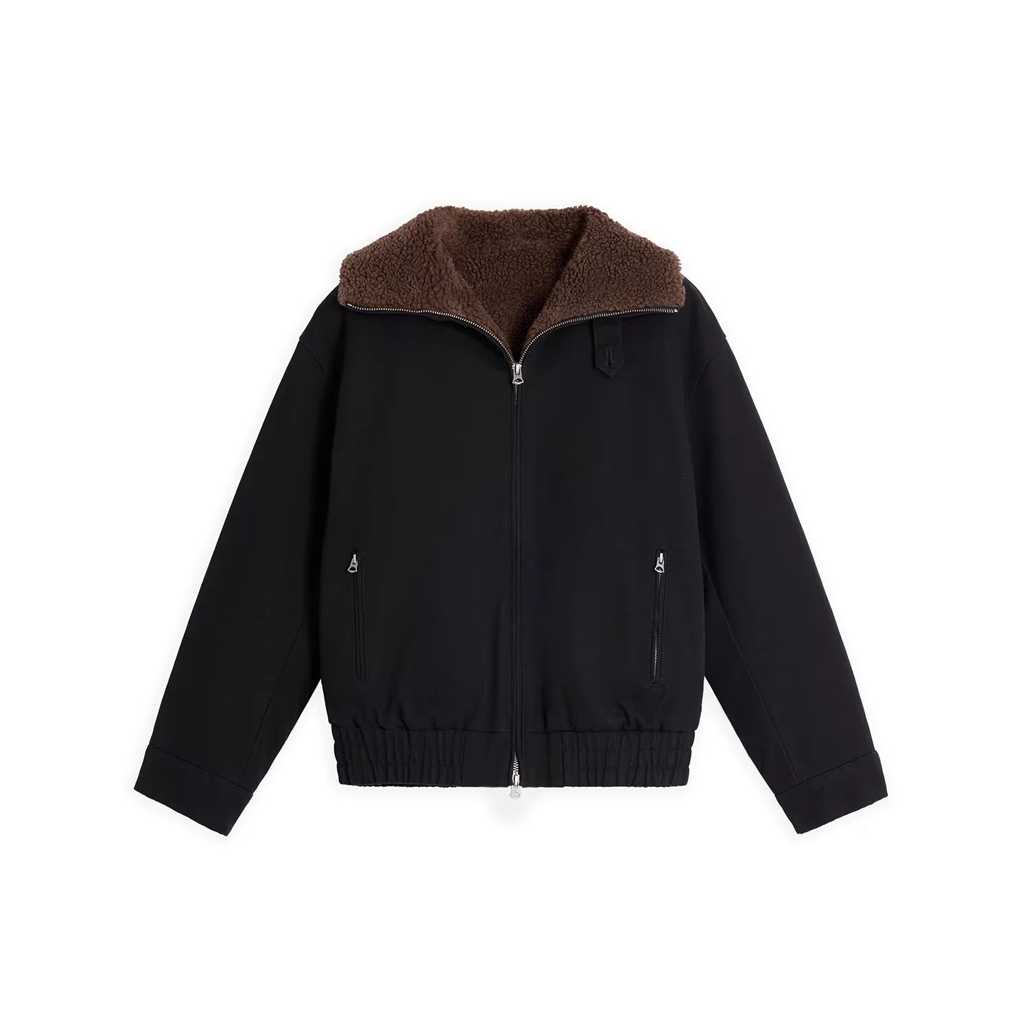 Stay warm and stylish during colder months with this women's loose fit cotton jacket. Made from 100% cotton canvas, it features a cozy faux shearling lining, a high collar, and a full-zip front for added warmth. The drop shoulder design, elasticated cuffs, and waistband offer a relaxed and flattering fit. Available in black and camel, this minimalistic winter jacket pairs perfectly with jeans for a casual yet polished look.