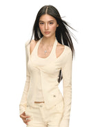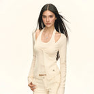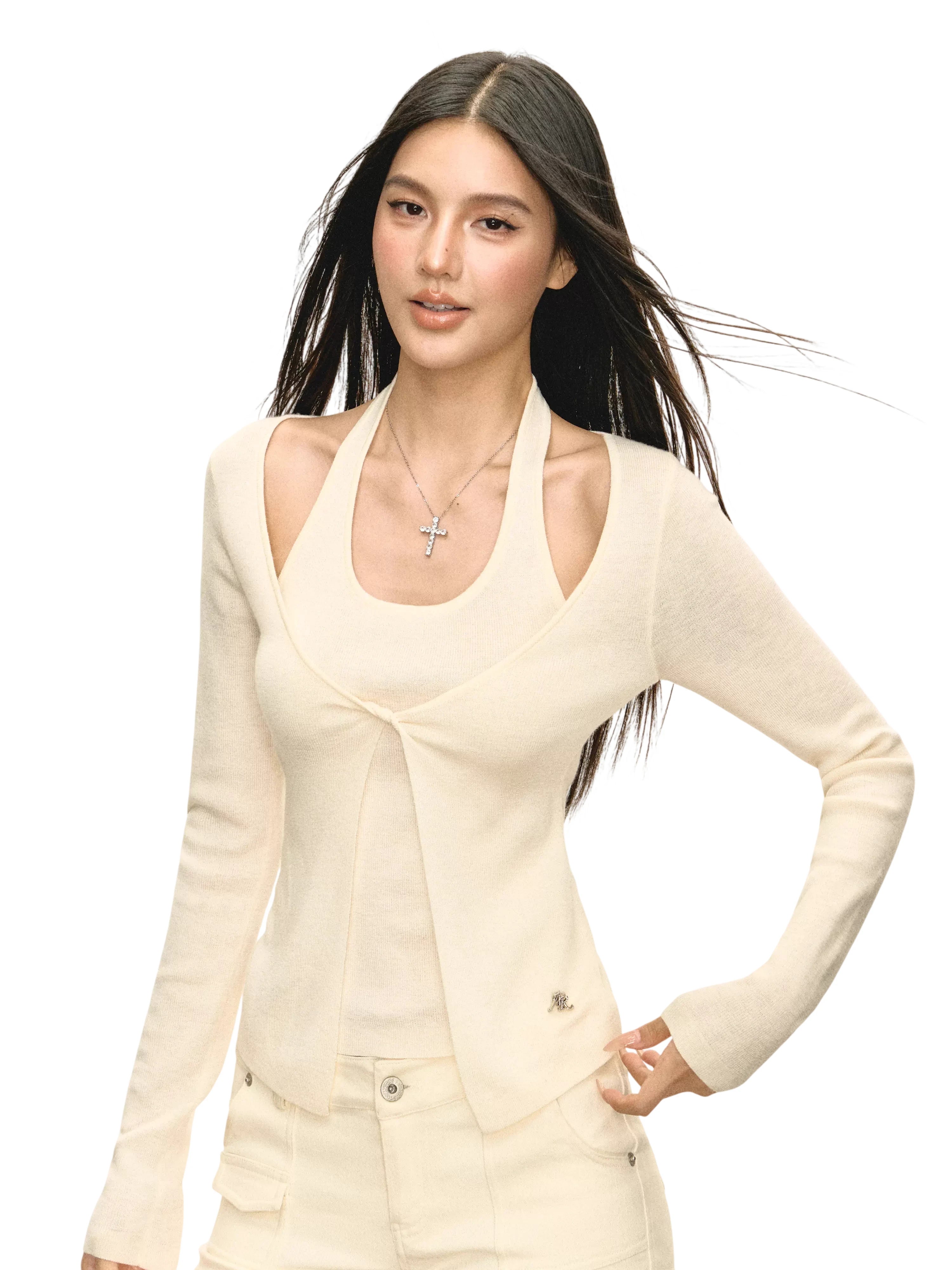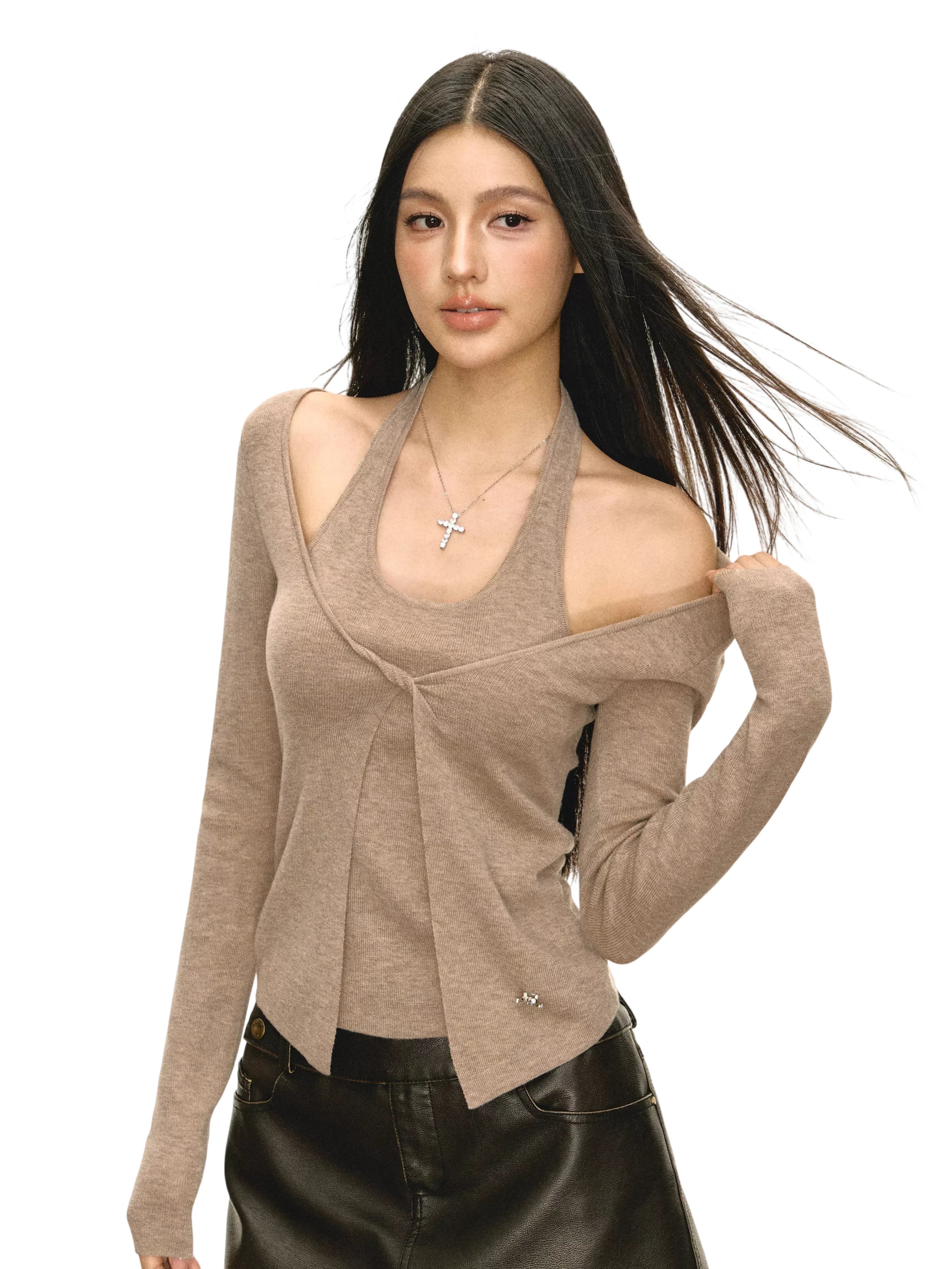 Stay stylish this autumn with this chic faux two-piece knitted sweater set for women. The design features a fitted halter neck crop top paired with a matching long sleeve open-front cardigan, creating a layered look without the bulk. Available in brown, light brown, and off-white, this soft knit ensemble is perfect for casual outings or date nights. Designed to flatter the feminine silhouette, it adds a modern and cozy touch to your seasonal wardrobe.