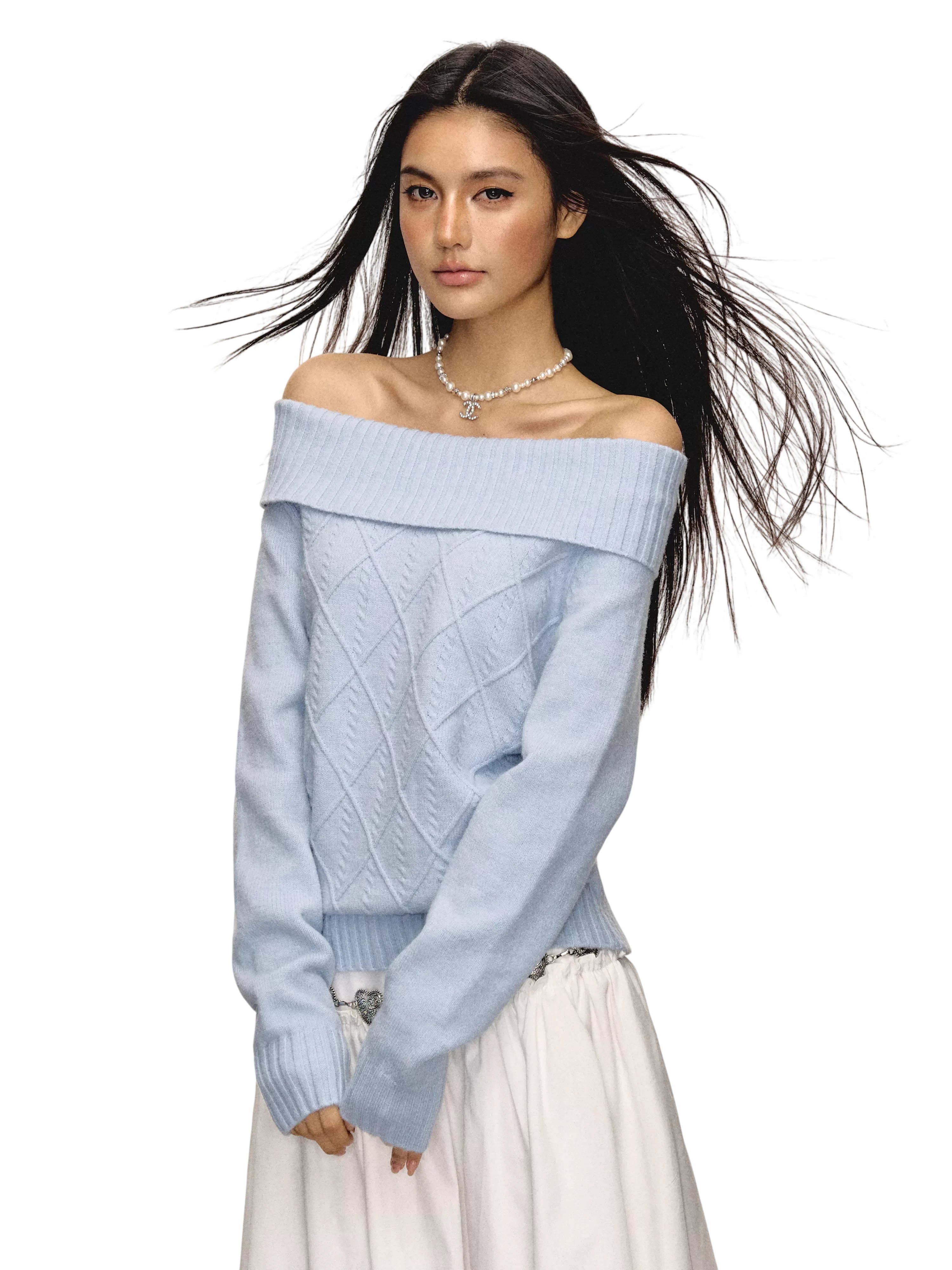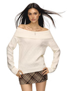 Stay stylish and warm this season with this off-shoulder long sleeve knit sweater designed for women. Featuring a cozy ribbed fold-over neckline and an intricate diamond-knit pattern on the front, this autumn-ready top blends comfort with a flattering slim fit silhouette. Available in multiple colors including grey, lavender, brown, white, and light blue, it's a versatile piece perfect for cool weather layering.
