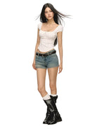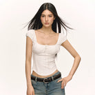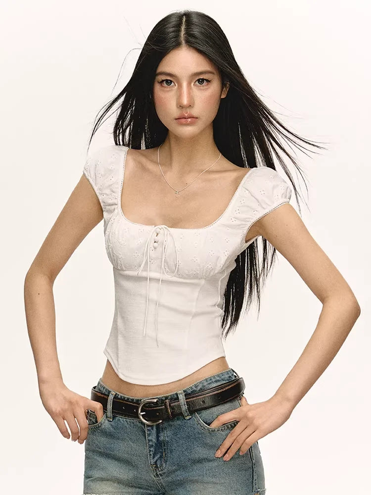 Elevate your summer wardrobe with this slim fit cropped T-shirt designed for women. Featuring a flattering square neckline and delicate puff sleeves, this top combines comfort with femininity. The corset-inspired silhouette is enhanced by lace detailing and a charming front bow closure, making it perfect for casual chic looks.