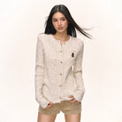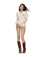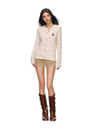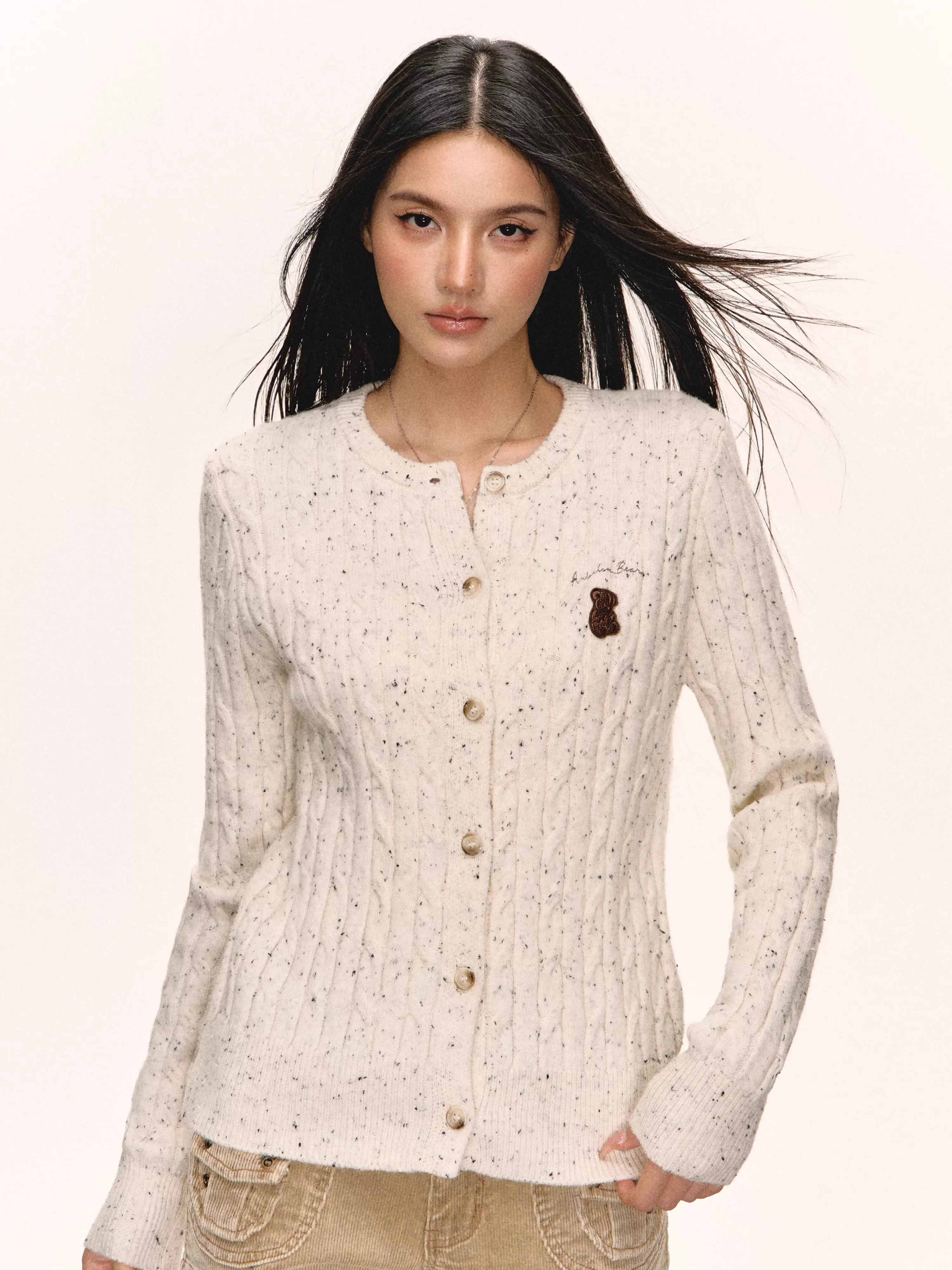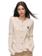 Stay cozy and stylish with this women's cable-knit cardigan, designed with a round neck and front button closure. Made from a soft, cream-colored speckled knit, it features a charming cable-knit texture for added warmth and visual appeal. The slightly oversized fit and long sleeves enhance comfort, while a delicate embroidered bear patch adds a playful, vintage-inspired touch. Perfect for layering during autumn, this slim-fit top blends timeless design with everyday comfort.