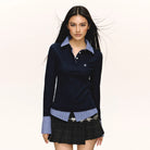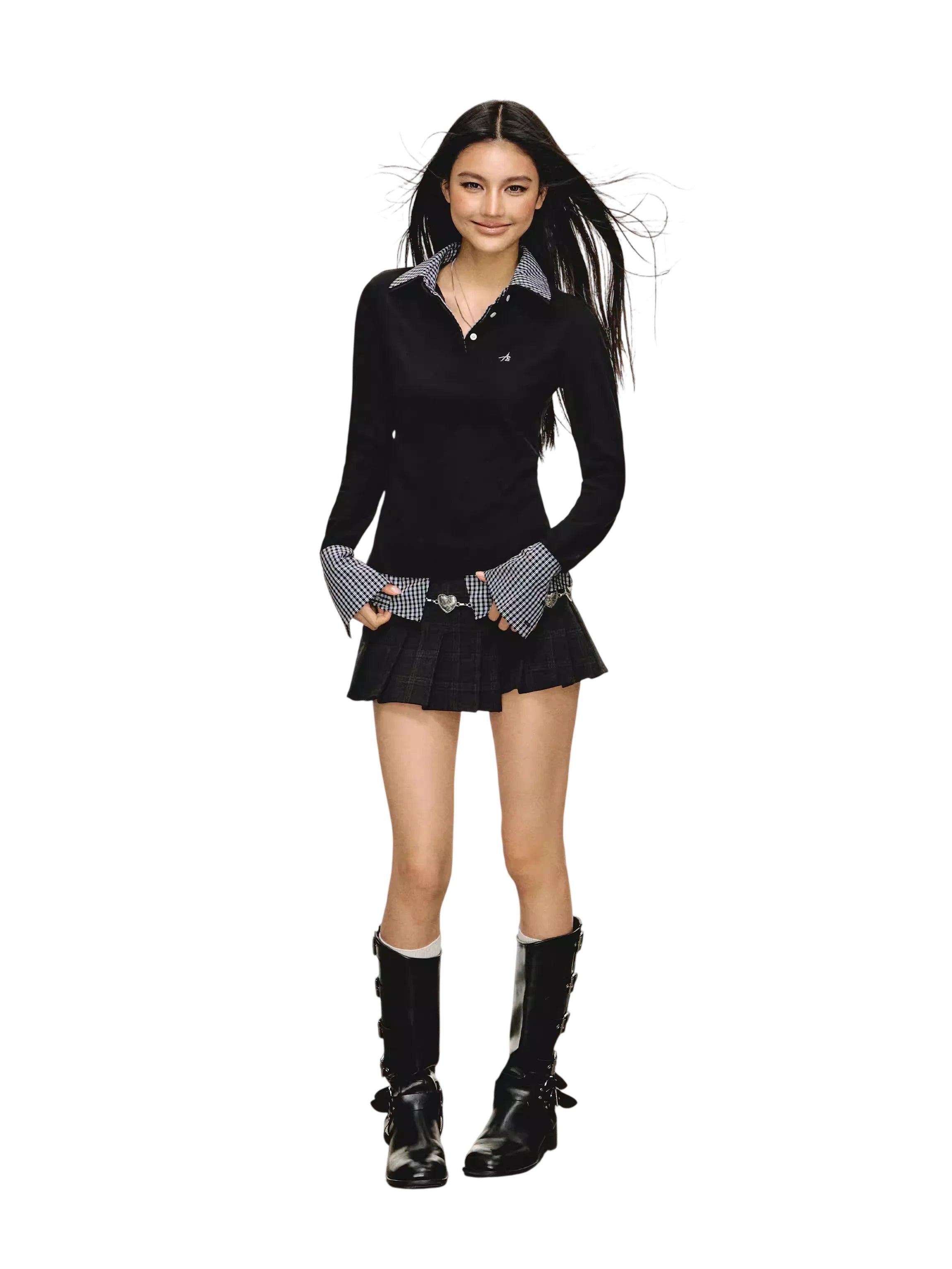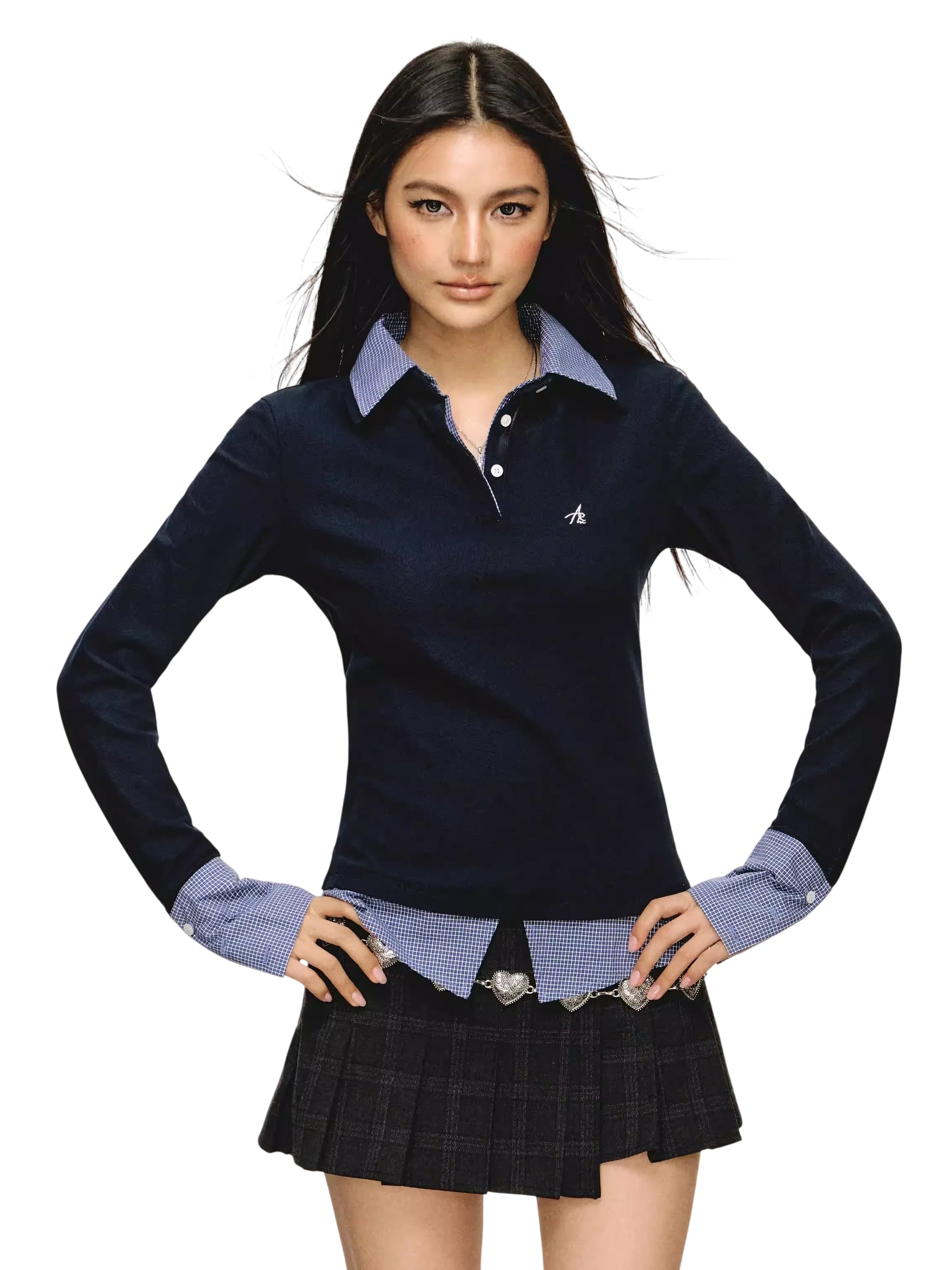 Elevate your autumn wardrobe with this stylish women's long sleeve polo shirt designed with a unique fake two-piece look. Featuring a classic buttoned neckline, contrast inner collar and cuffs in check or stripe patterns, and a subtle embroidered chest detail, this shirt blends casual comfort with a refined touch. Perfect as a base layer or standalone piece for transitional weather.