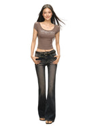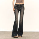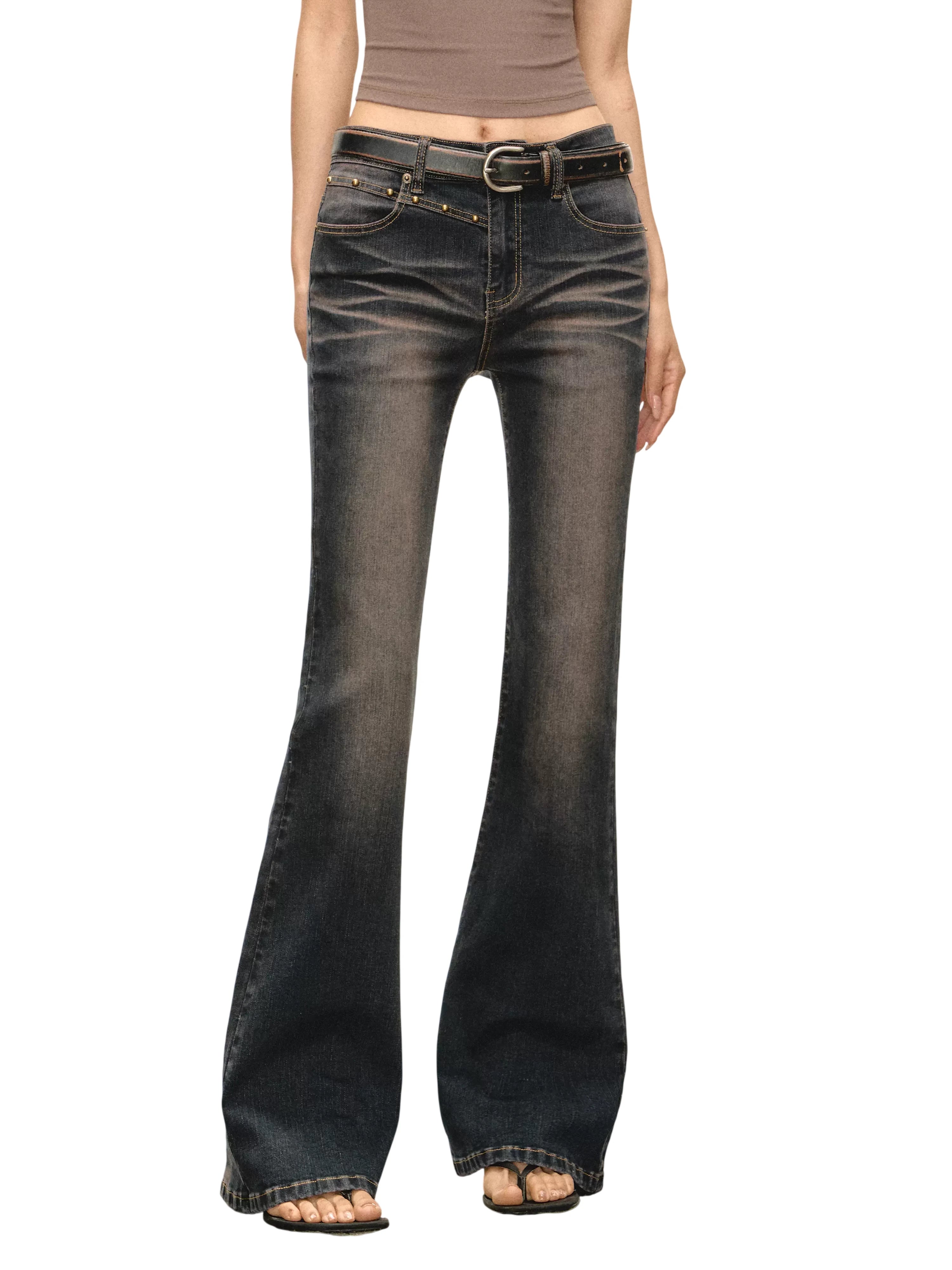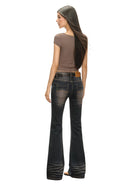Designed with a retro-inspired silhouette, these women's high-waisted flared jeans offer a sleek slim fit through the thighs before gently flaring at the legs. The dark-washed denim features subtle fading across the thighs and knees, adding a stylish worn-in look ideal for autumn fashion. These long pants are perfect for casual or elevated everyday wear, providing both comfort and timeless appeal.