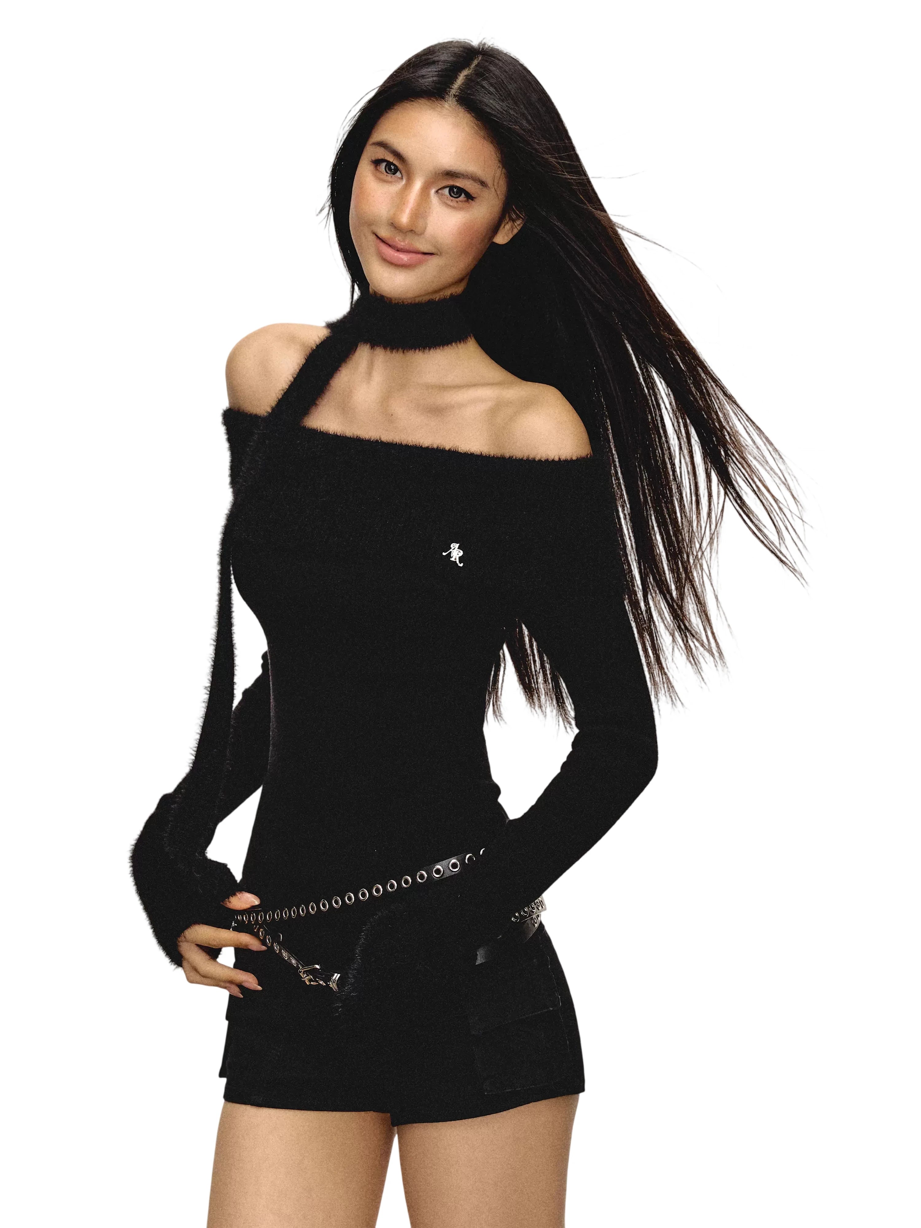 ARISEISM Women's Off-Shoulder Long Sleeve Knit Top with Choker Detail