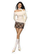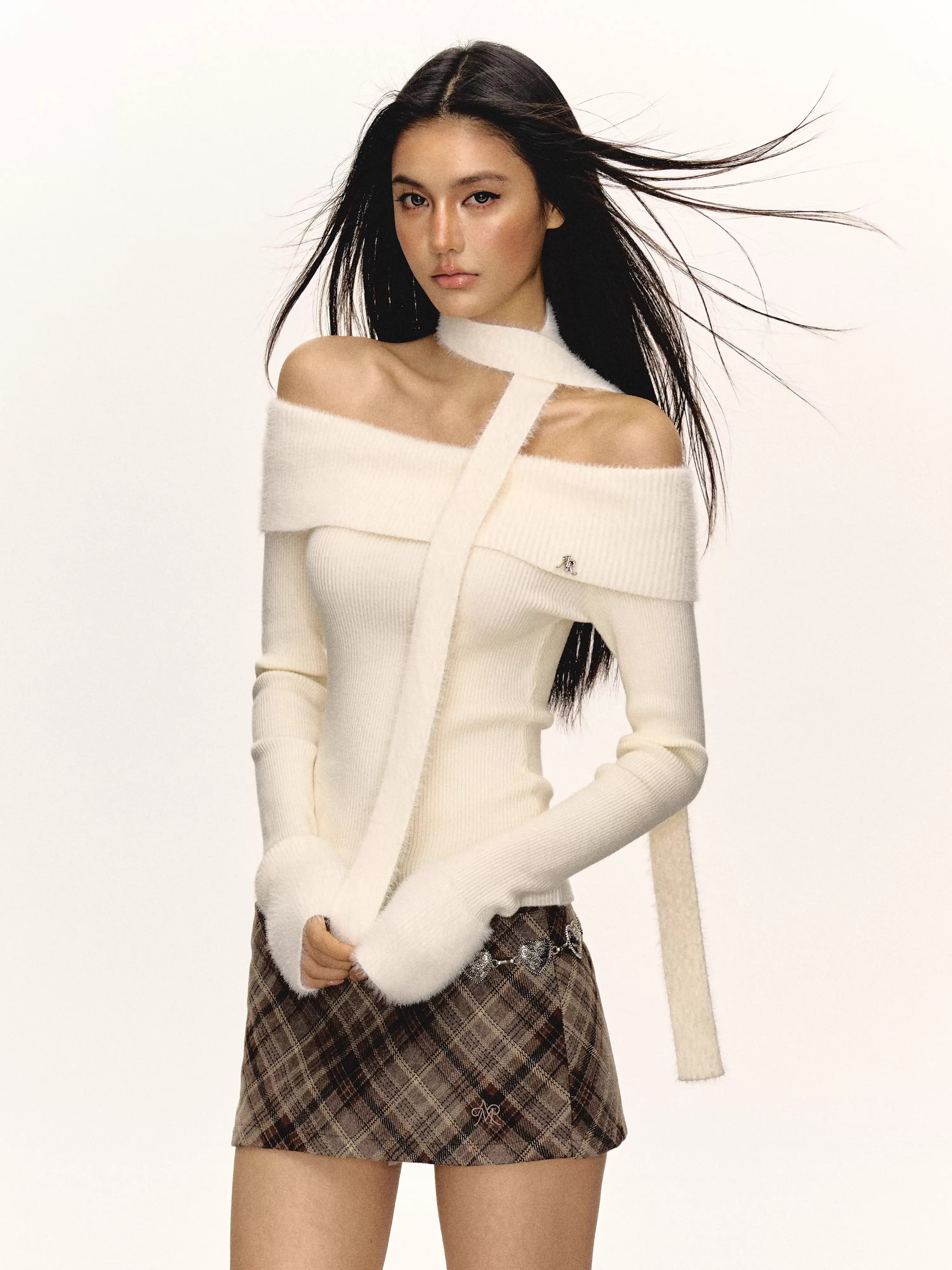 Elevate your autumn wardrobe with this chic women's off-shoulder long sleeve knit top. Crafted from a soft, stretchable ribbed fabric, it offers a flattering, fitted silhouette perfect for layering or wearing on its own. The standout feature is a unique built-in scarf or choker-style detail that adds a modern, edgy twist to a classic design. Available in versatile colors like beige, black, white, and light yellow, this top is a stylish essential for the cooler season.