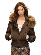 Stay warm and stylish with this women's short padded jacket, perfect for autumn and winter seasons. Designed with a cropped fit, this jacket features a cozy detachable faux fur collar for added comfort and elegance. The front includes a secure zipper and snap button closure, while two flap side pockets offer practicality. A ribbed waistband helps seal in warmth, making it a great choice for colder days. Available in multiple classic colors including white, dark brown, and black.