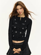 This stylish women's cardigan features a slim fit design with charming embroidered puppy illustrations and playful "Awesome" lettering on the front. Made from soft knit fabric, it includes long sleeves and a front zip closure for a modern, fitted silhouette. Perfect as an autumn inner layer, this crop-length cardigan adds a fun and cozy touch to your seasonal wardrobe. Available in multiple colors including white, grey, navy, and black.
