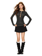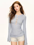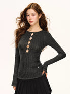 Elevate your autumn wardrobe with this sleek and stylish slim fit ribbed knit top for women. Designed with a modern silhouette, this long sleeve top features four decorative circular cut-outs aligned vertically along the chest for a bold yet elegant touch. The soft, stretchy ribbed fabric hugs the body for a flattering look, while the round neckline adds classic charm. Available in multiple colors, this versatile base layer pairs easily with your favorite jeans or skirts for a chic seasonal outfit.