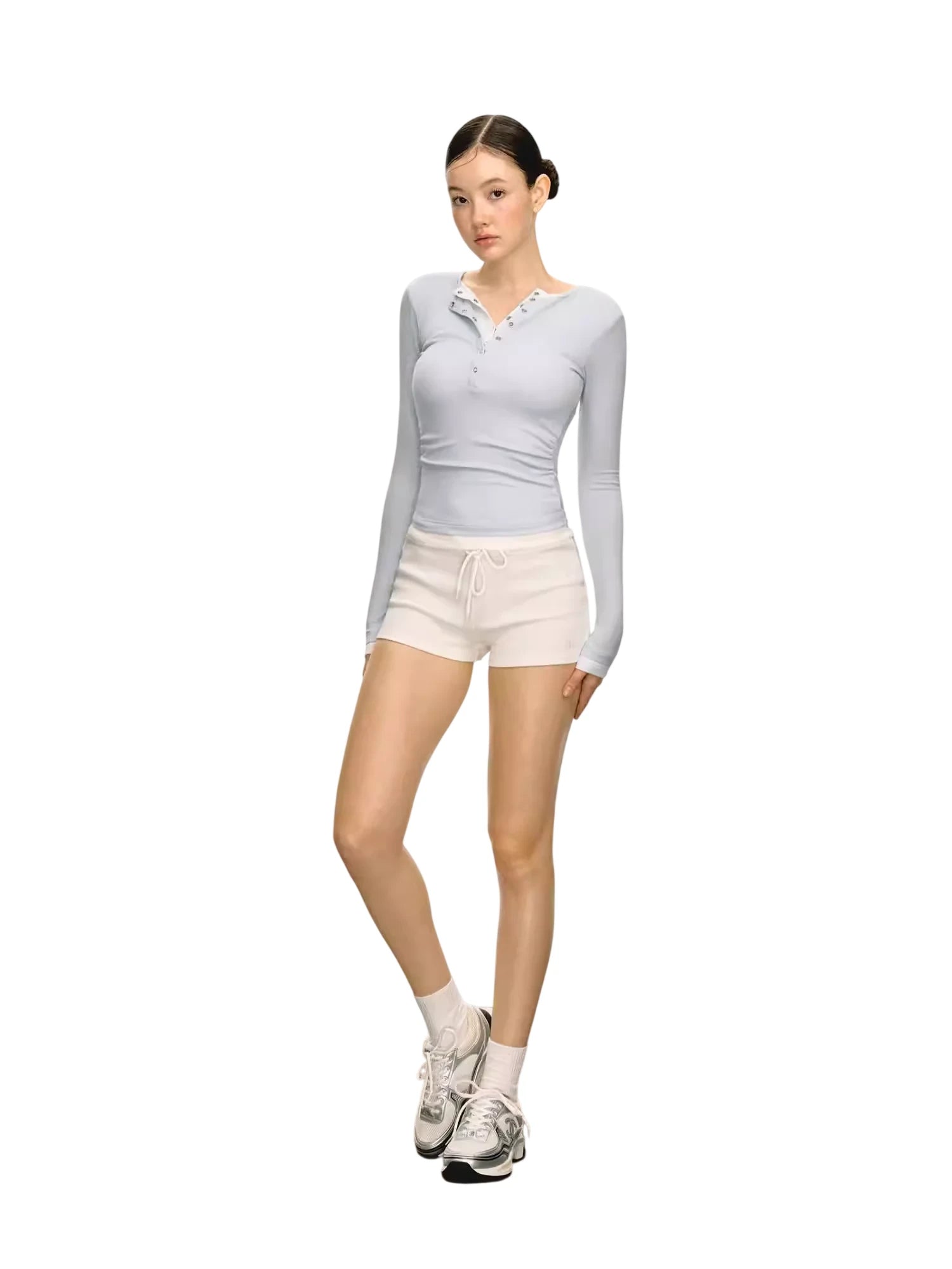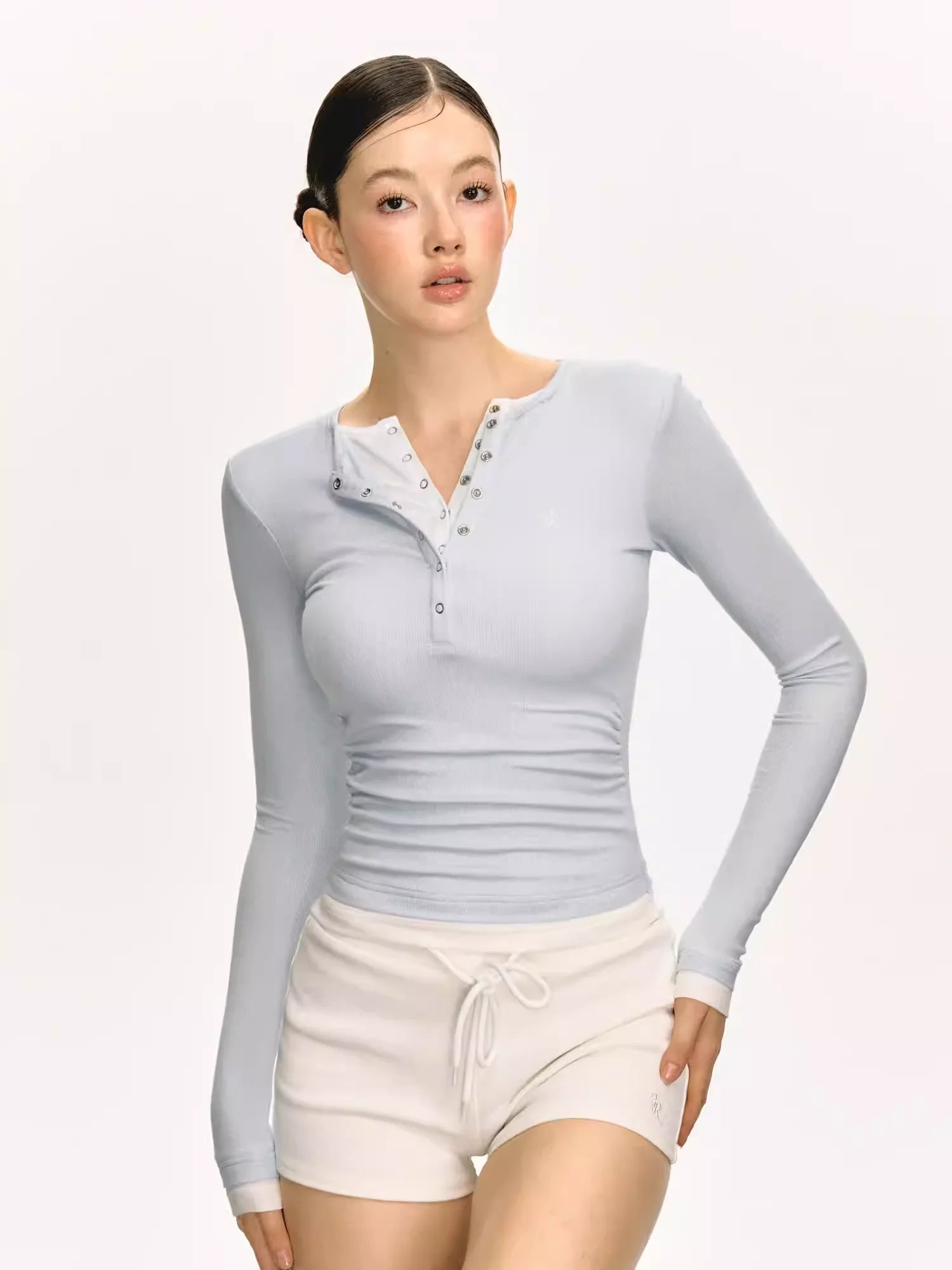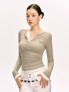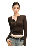 Elevate your autumn wardrobe with this women's slim fit long sleeve Henley top, designed with a stylish layered-look neckline. Featuring a contrasting inner layer and a partially buttoned placket, this top blends casual charm with versatile wearability.