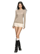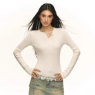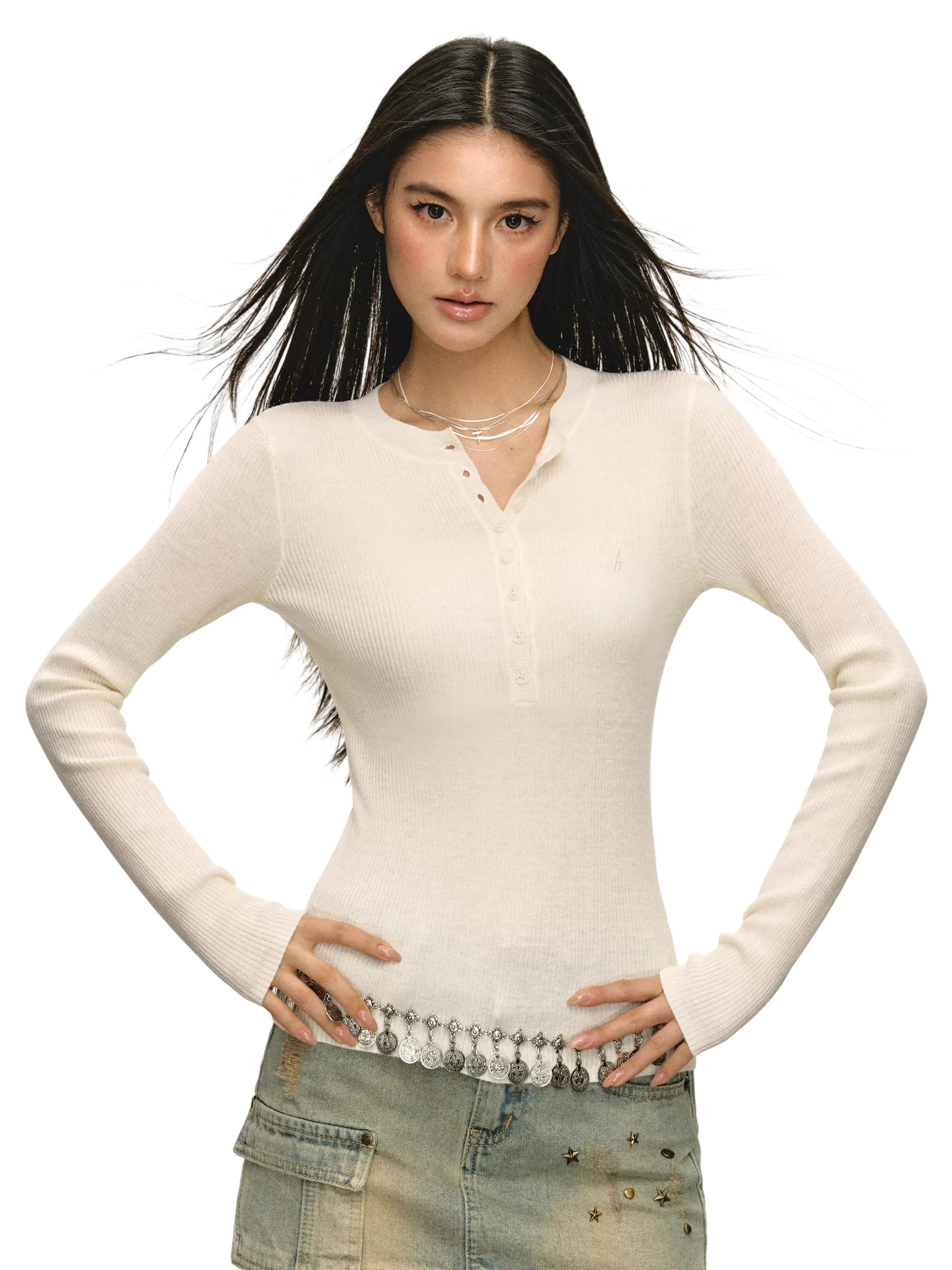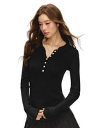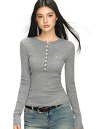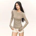 This women's slim fit knit top features a ribbed texture and classic long sleeves, ideal for layering in autumn. Designed with a henley-style front, it includes eight small vertical buttons and a round neckline for a timeless look. Available in four versatile colors—beige, white, black, light grey, and taupe—this top brings comfort and style together as a perfect base layer for cooler seasons.