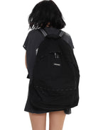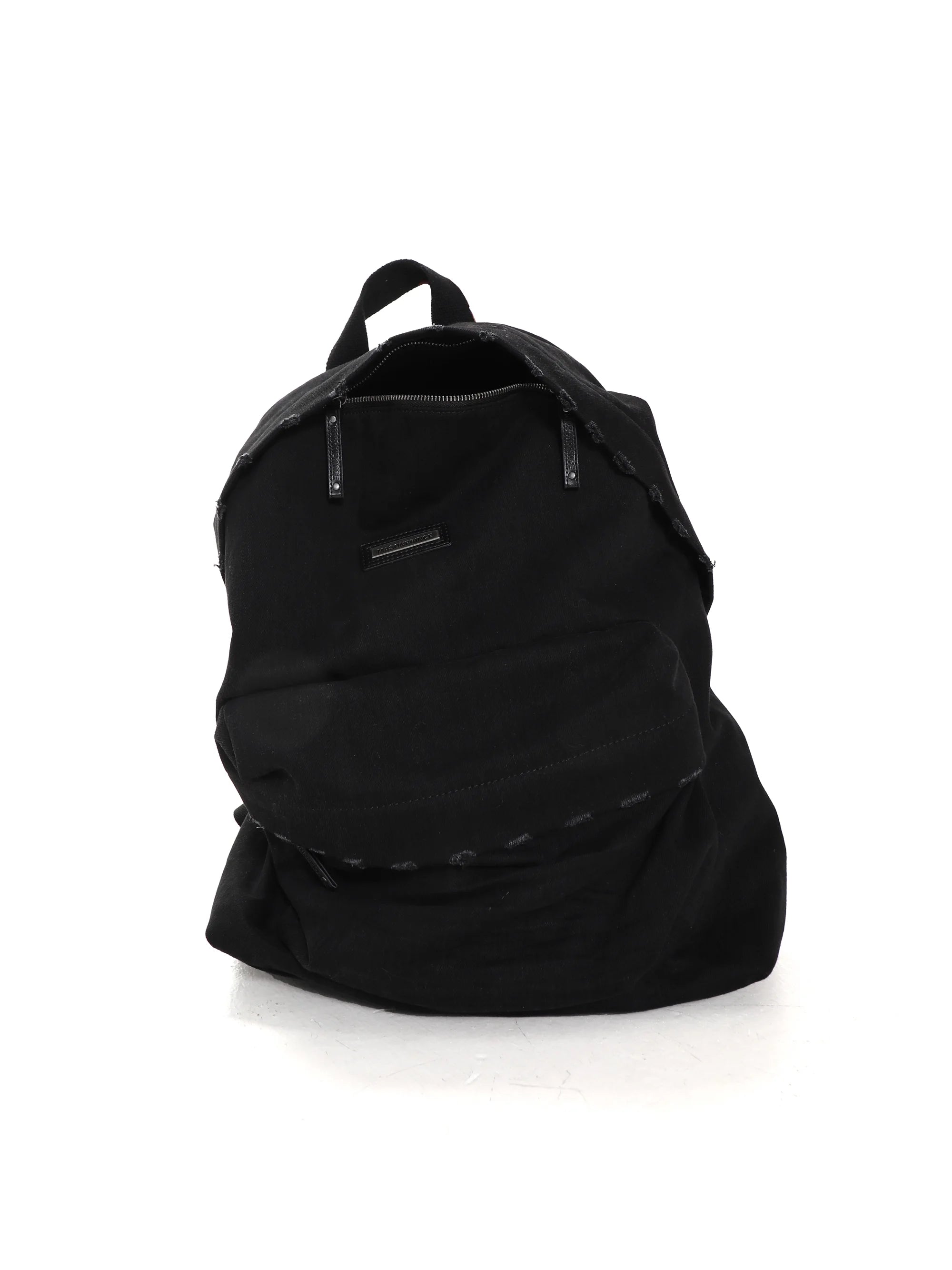 This versatile large-capacity backpack is crafted from soft, distressed denim, offering both style and functionality. Featuring a clean black design with a front zipper pocket and a subtle brand tag, it combines utility with a sleek, urban aesthetic.