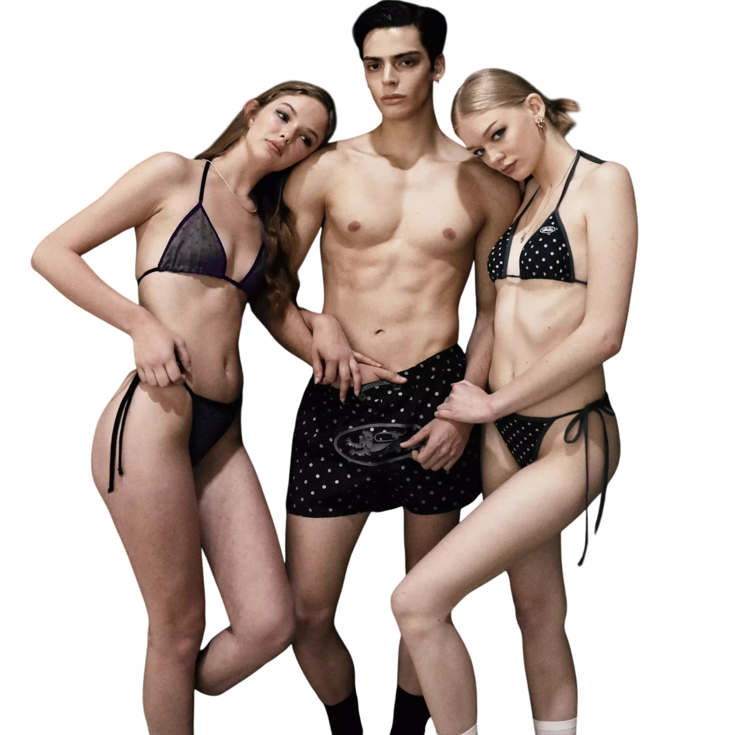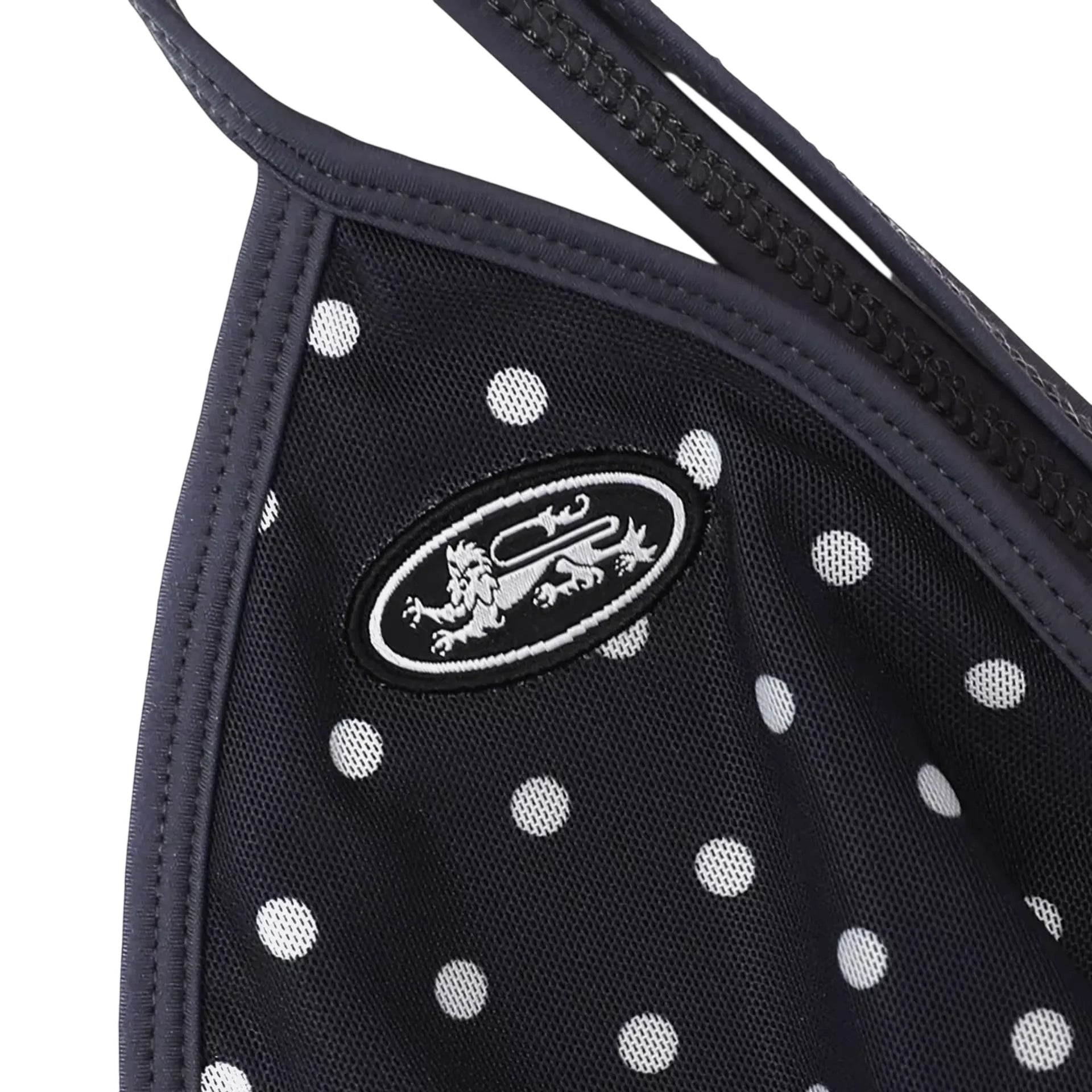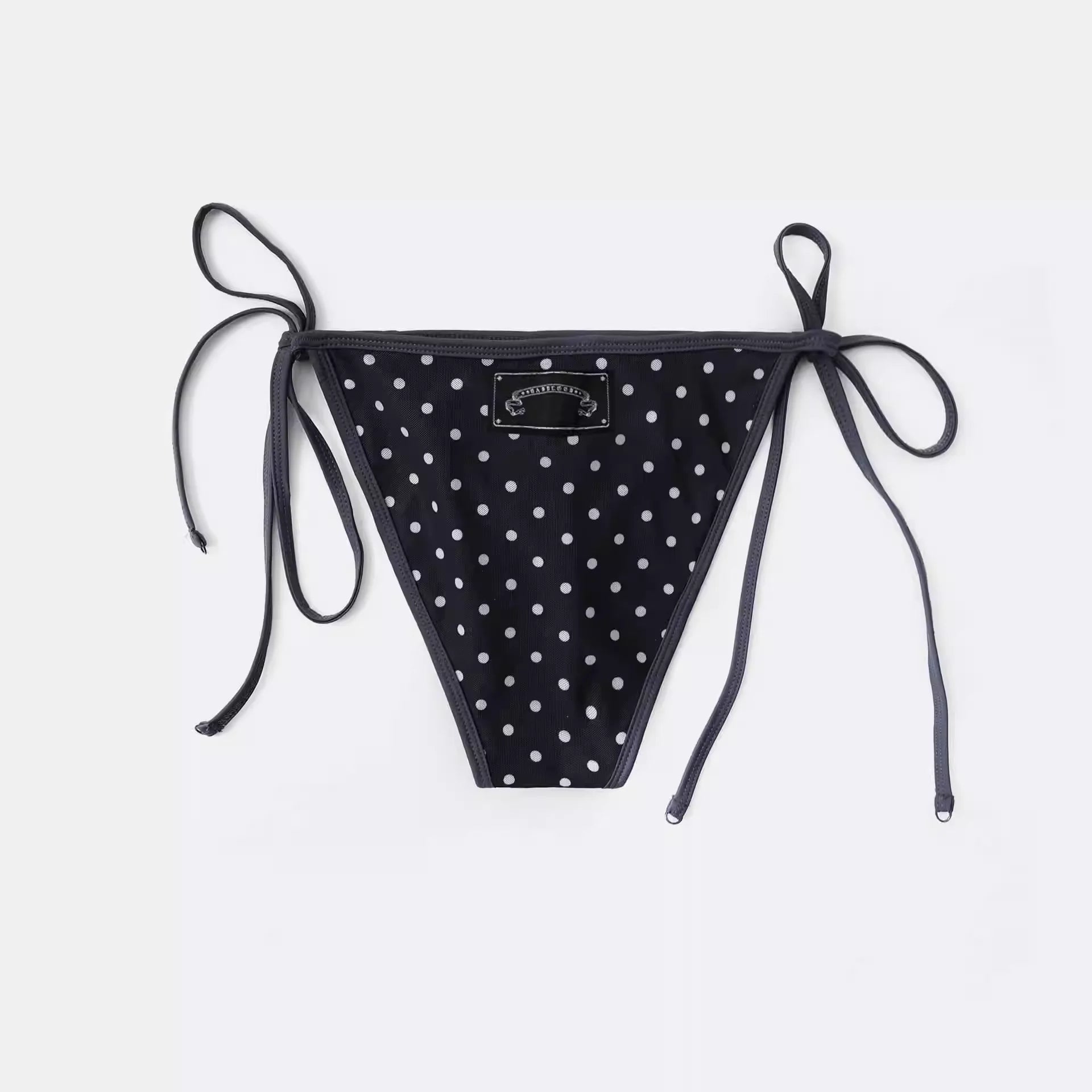 This women's triangle bikini bottom features a timeless black-and-white polka dot pattern for a retro-inspired look. Designed with adjustable side ties, it provides a customizable fit and classic beachwear style. A small metallic accent on the waistband adds a subtle designer touch. Perfect for mixing and matching with your favorite bikini tops.