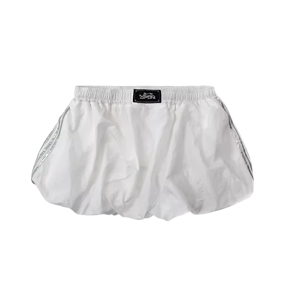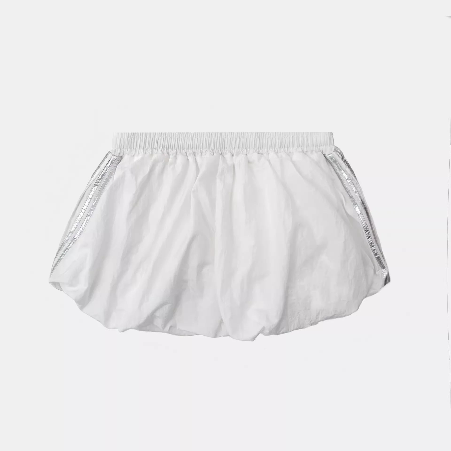 This white nylon balloon mini skirt features a sporty silhouette with a crinkled texture, offering a modern streetwear vibe. Its high-waisted design delivers a flattering fit, while the lightweight fabric provides comfort and ease of movement. Perfectly suited for women's athleisure or casual wear, this skirt combines edge with minimalism for a bold, fashion-forward look.