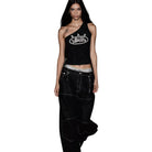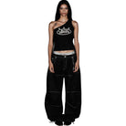Make a bold style statement with these edgy, wide-leg streetwear pants in denim black. Designed with a relaxed, oversized fit, they feature standout white stitching and striking hardware details including chains and key clips. Worn low on the hips for a rebellious look, these pants bring serious attitude to any outfit. Ideal for women embracing urban fashion with confidence and flair.