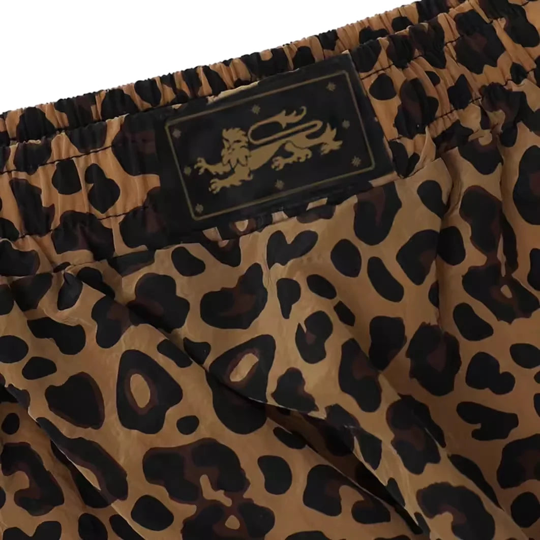 This ruffled mini skirt features a bold brown leopard print on a lightweight nylon fabric, offering a sporty yet stylish edge. Designed with a flirty silhouette and dynamic texture, it is perfect for making a statement. Styled here as part of a coordinated ensemble, this piece pairs perfectly with cropped jackets or relaxed sportswear for a contemporary, fashion-forward look.