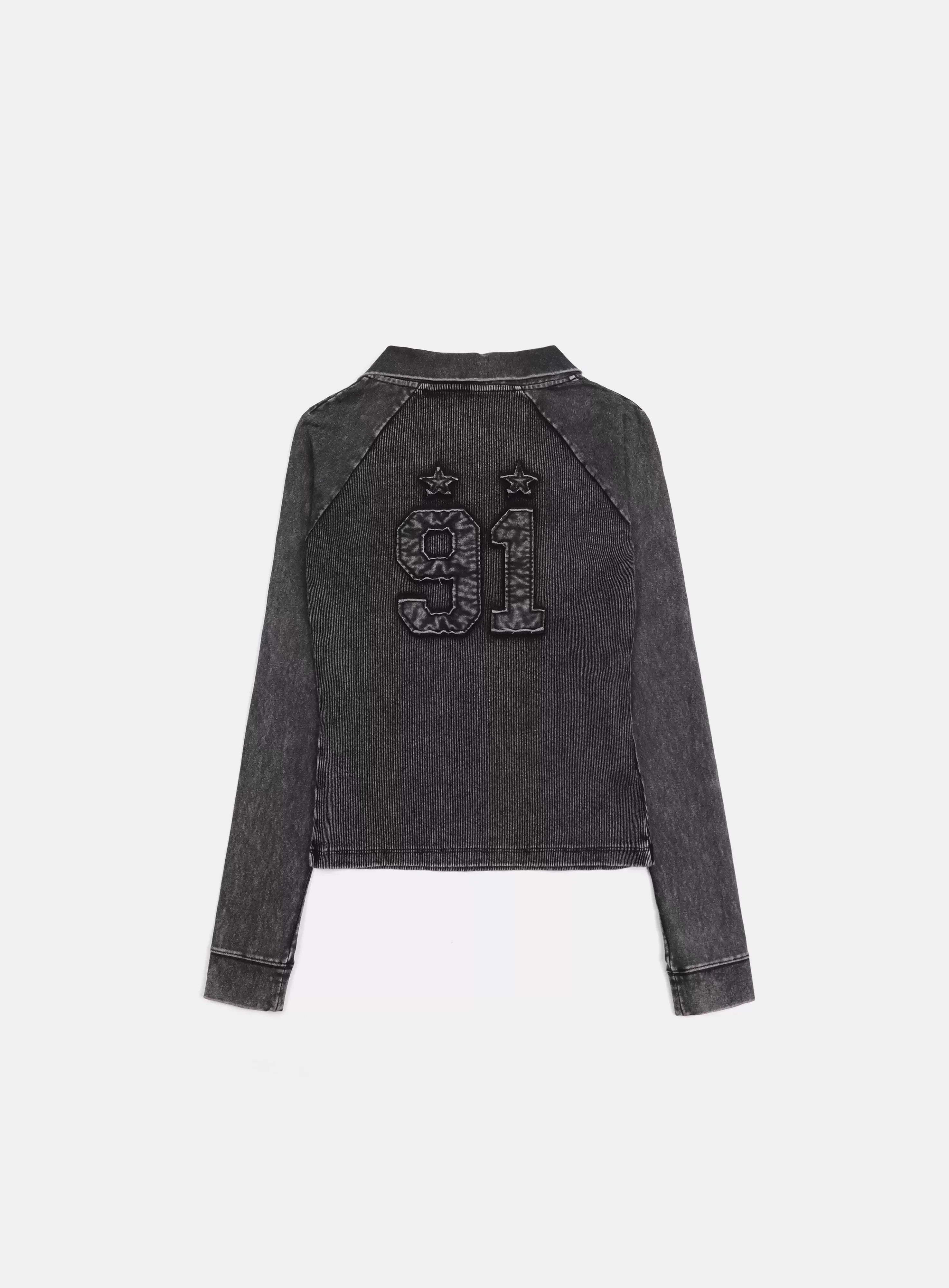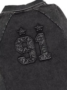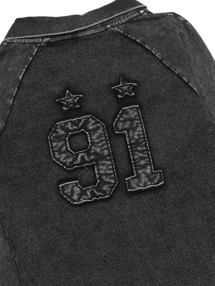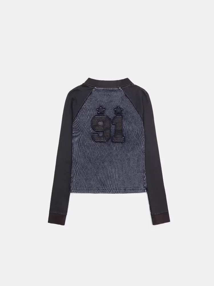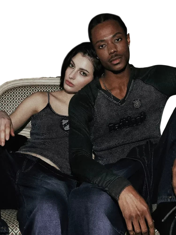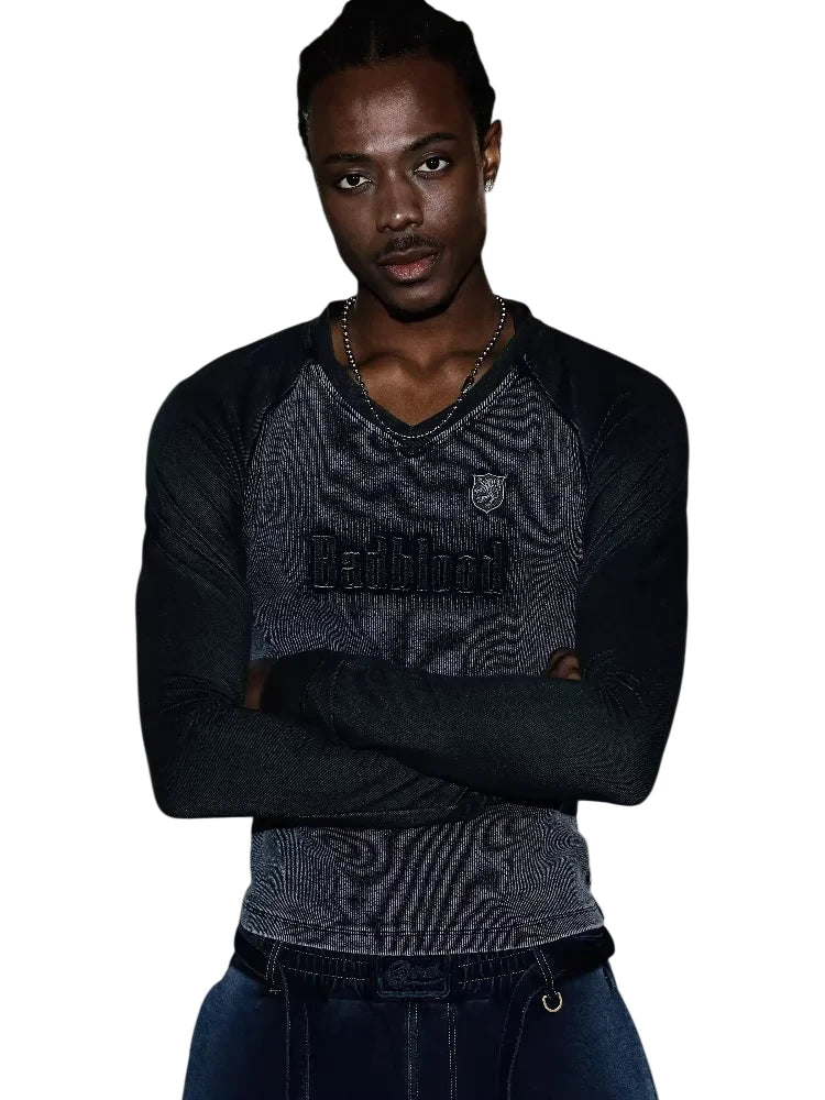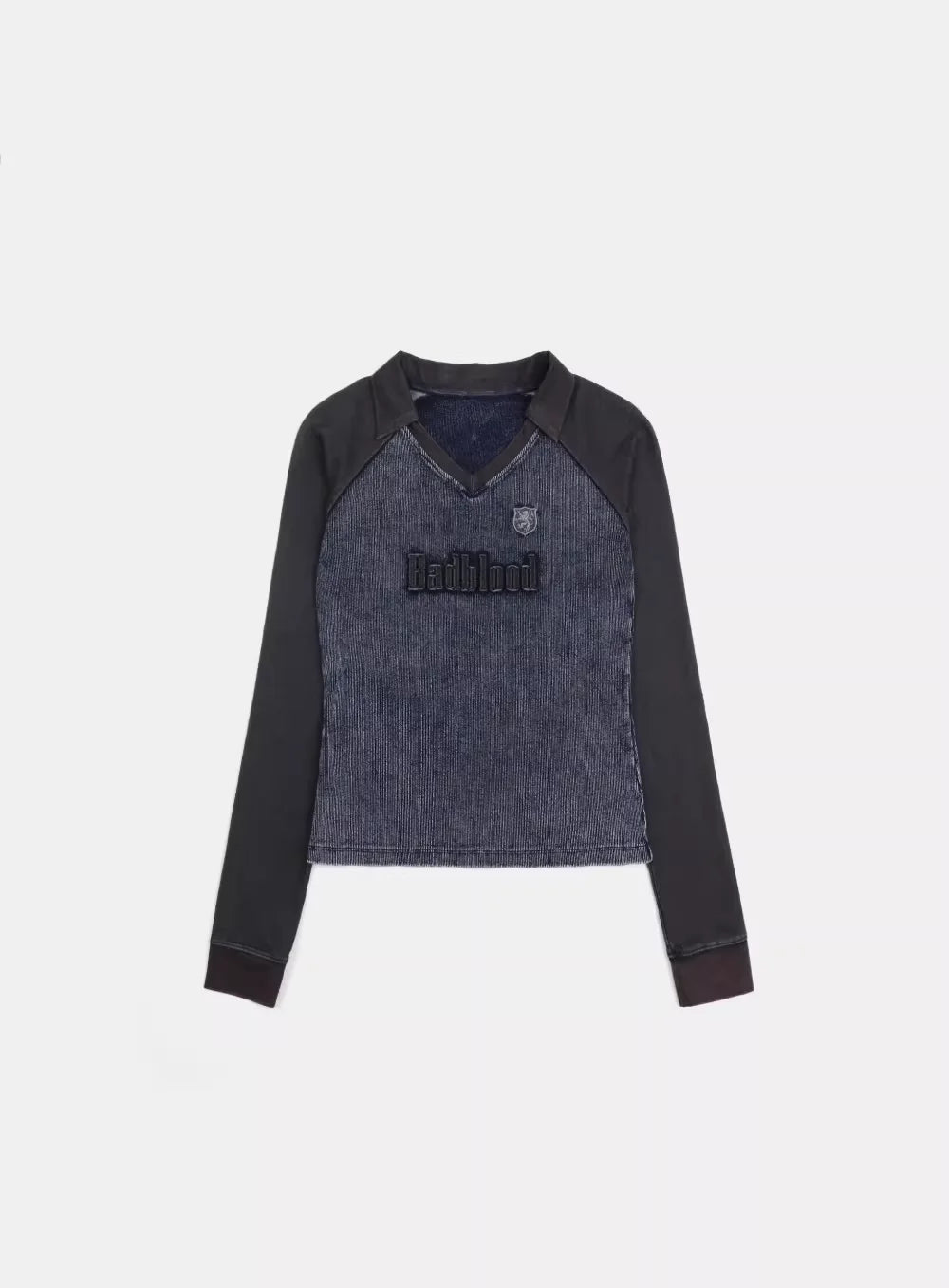 This men's long sleeve shirt features a stylish V-neck design and a two-tone color palette with dark sleeves and a textured blue and black denim-inspired torso. The casual yet polished look is perfect for everyday wear, offering comfort and versatility. Embroidered details on the chest add a refined touch, making it ideal for pairing with jeans or layered under jackets.