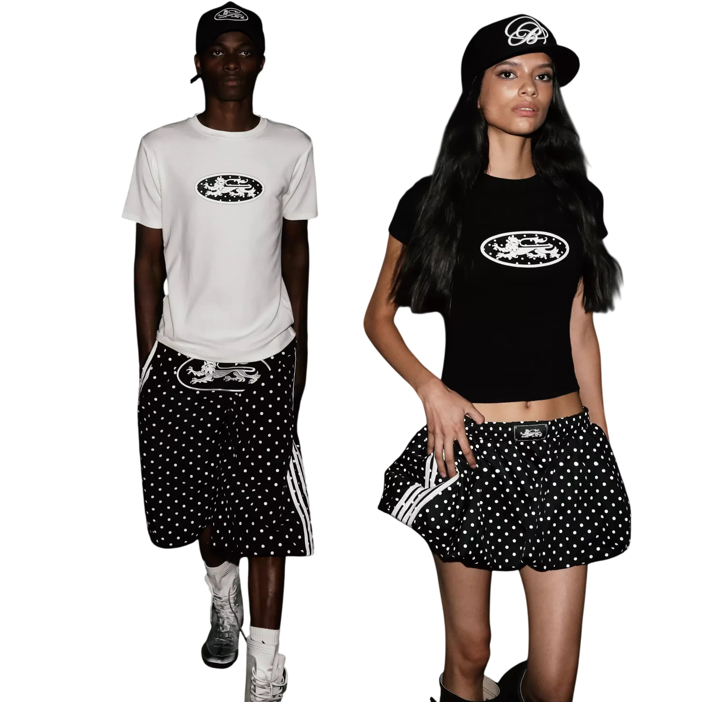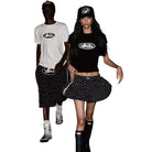 This high-waisted nylon mini skirt features a playful balloon silhouette and a bold black-and-white polka dot pattern. Its flared design offers dynamic movement and a street-chic aesthetic, making it a standout piece for urban styling. Worn here by a female model, it is paired with a cropped t-shirt and knee-high boots for an edgy, contemporary look.