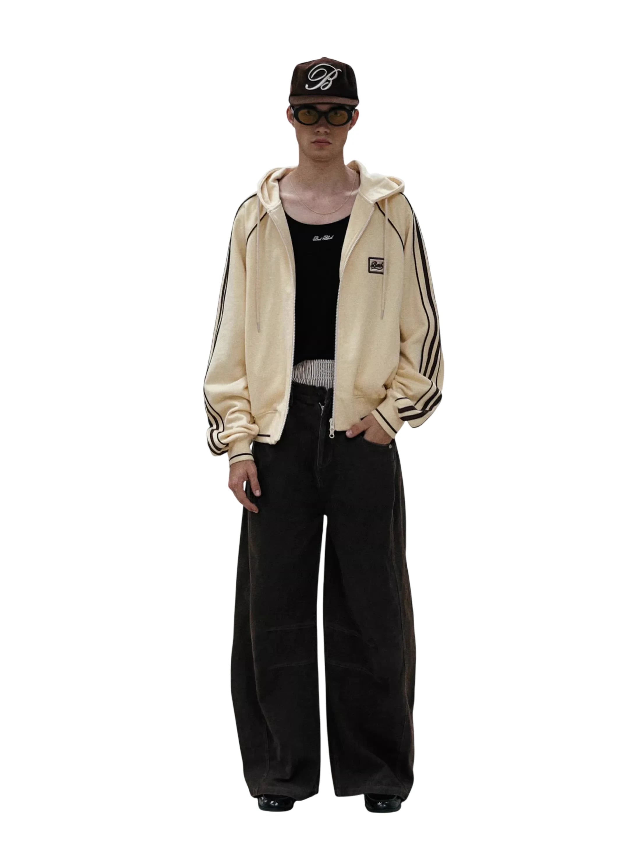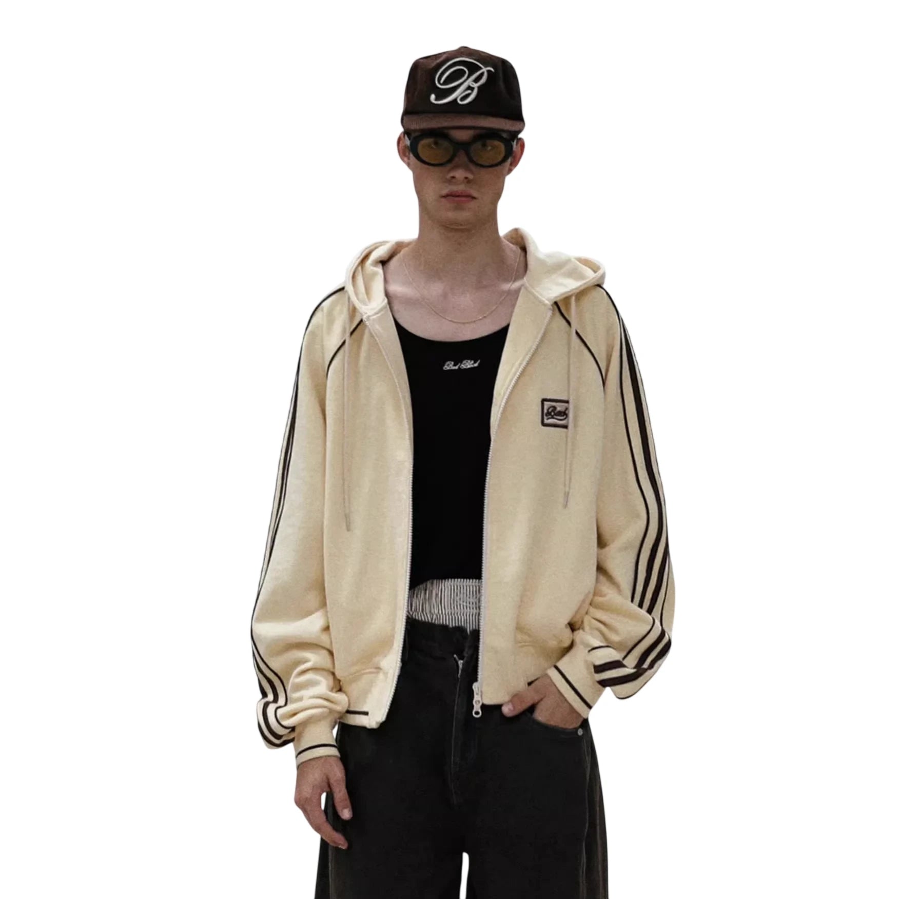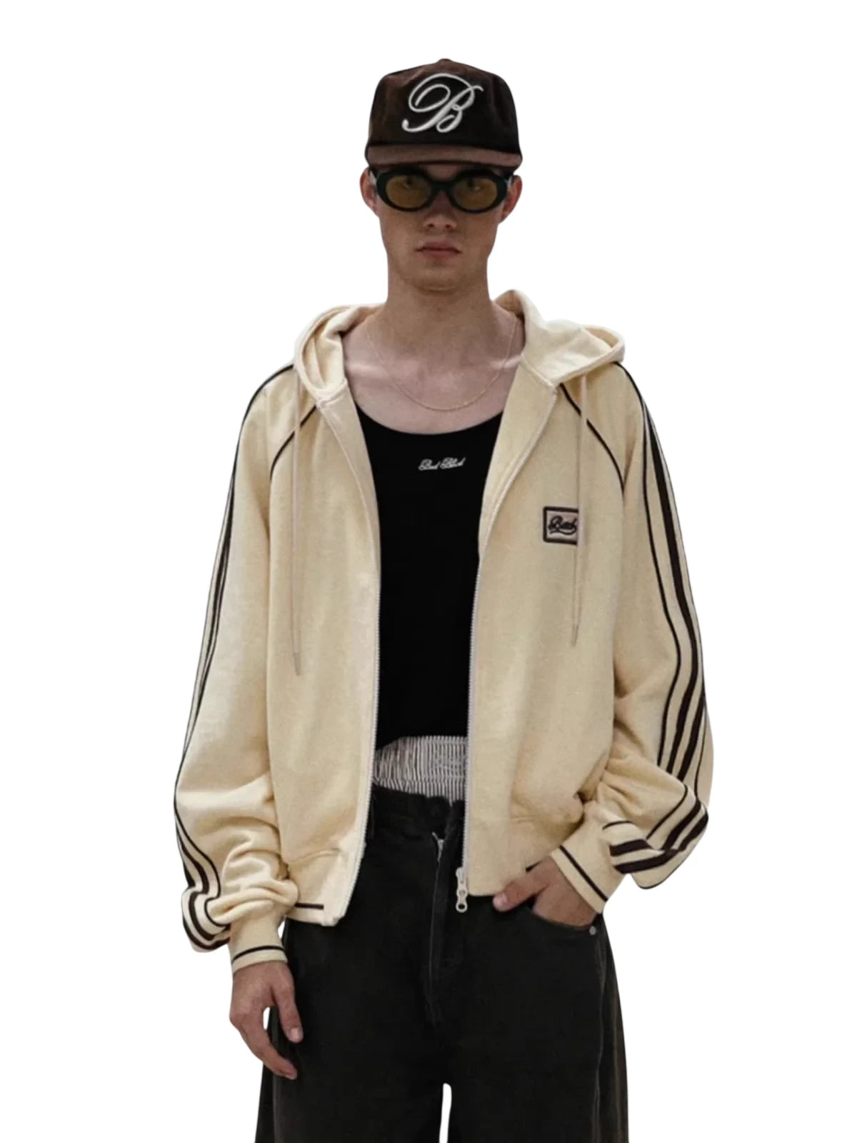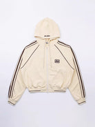 Stay stylish and comfortable this autumn with this oversized zip-up hoodie jacket designed for women. Featuring a casual American retro aesthetic, this light yellow hoodie includes bold black vertical stripes along the sleeves and a patch detail on the chest. The roomy fit and soft material make it ideal for layering over your favorite casual pieces.