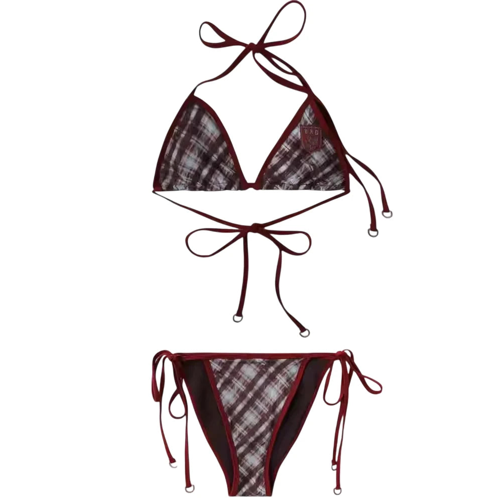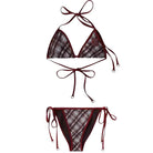 This stylish women's two-piece bikini set features a classic triangle top with neck and back tie closures and matching side-tie bottoms. The design showcases a rich plaid pattern in red, white, and gray tones, complemented by solid maroon trim for added contrast. A subtle emblem detail on the top adds a fashionable touch, making it a standout choice for the beach or poolside.