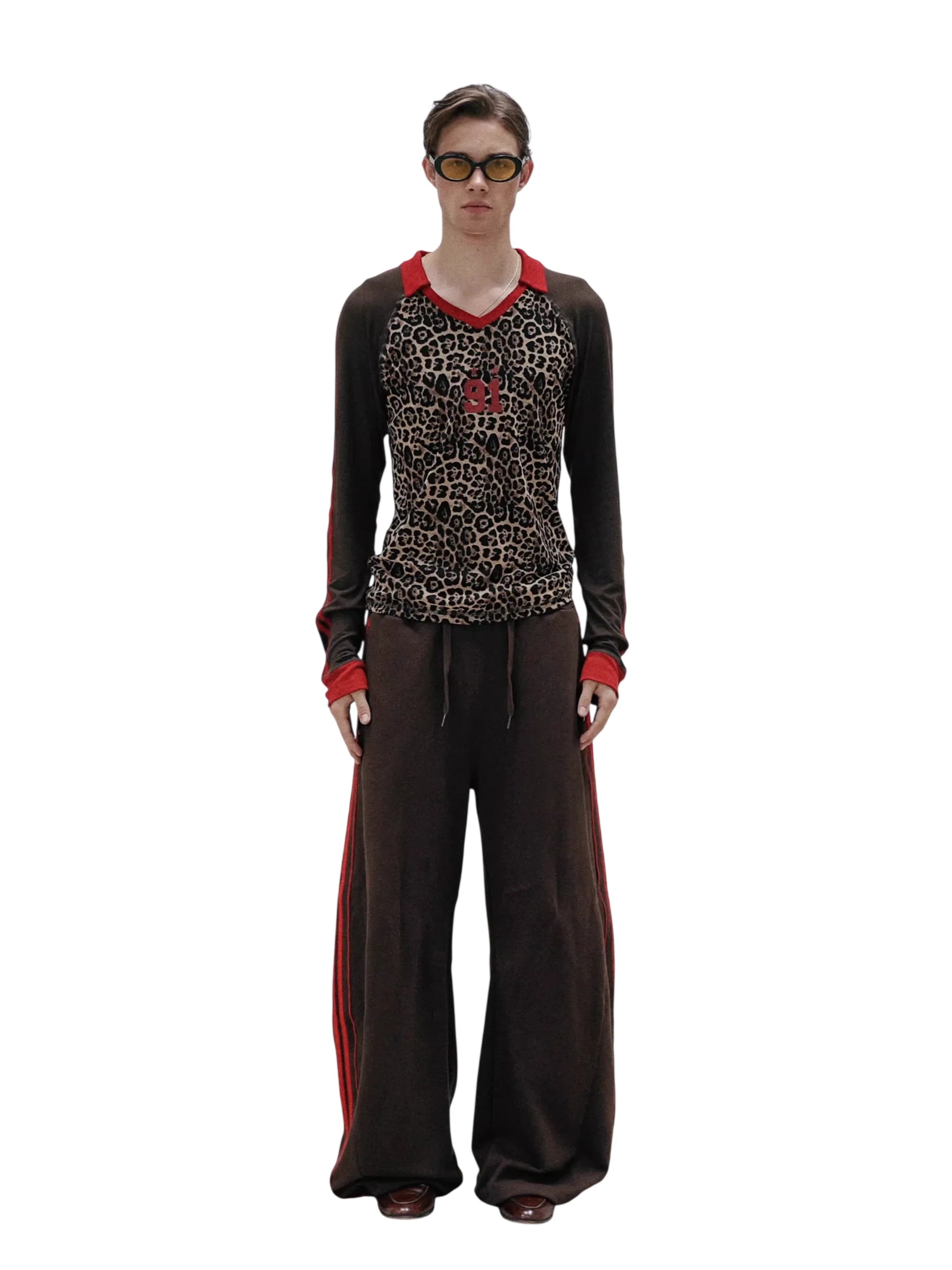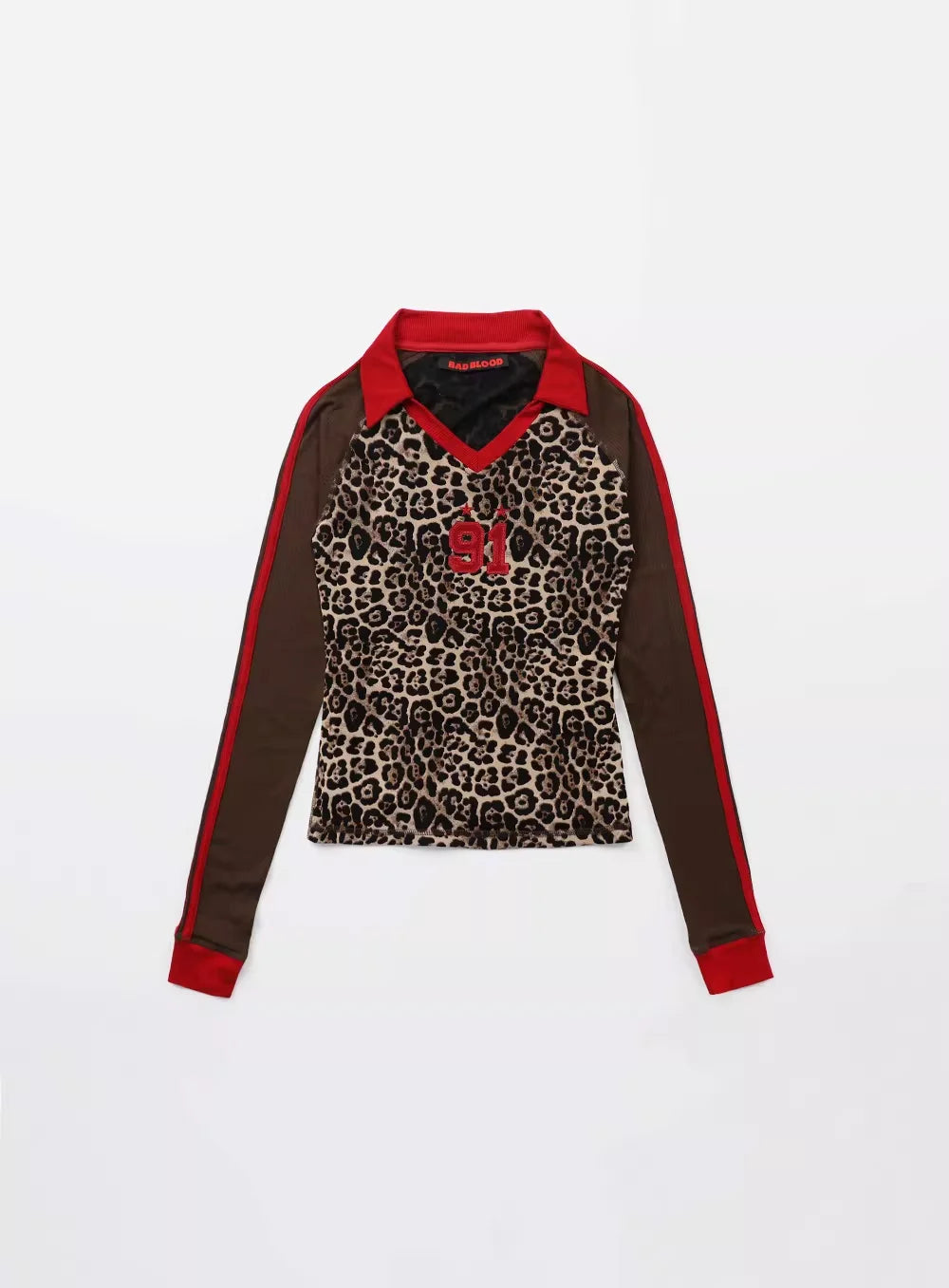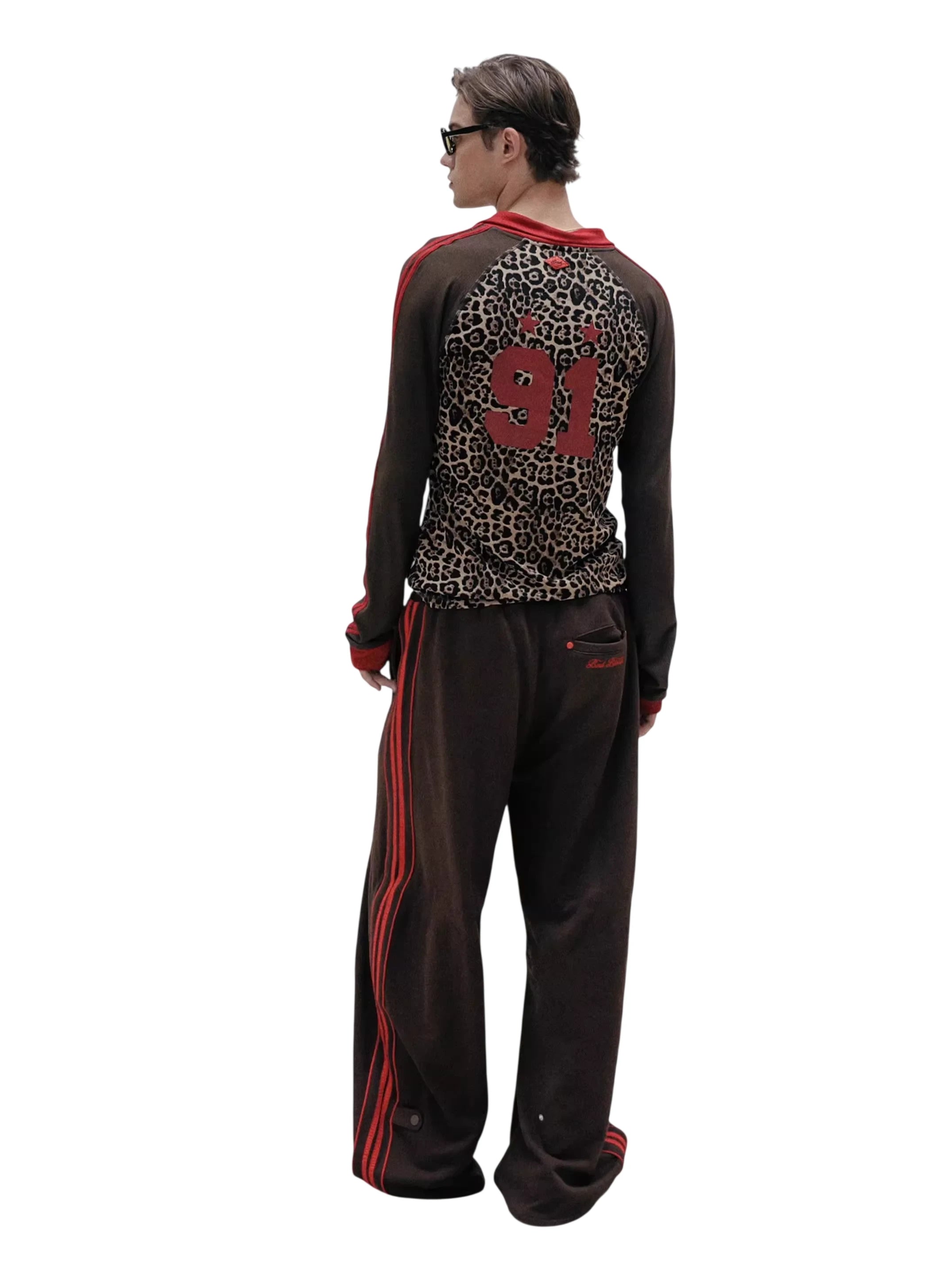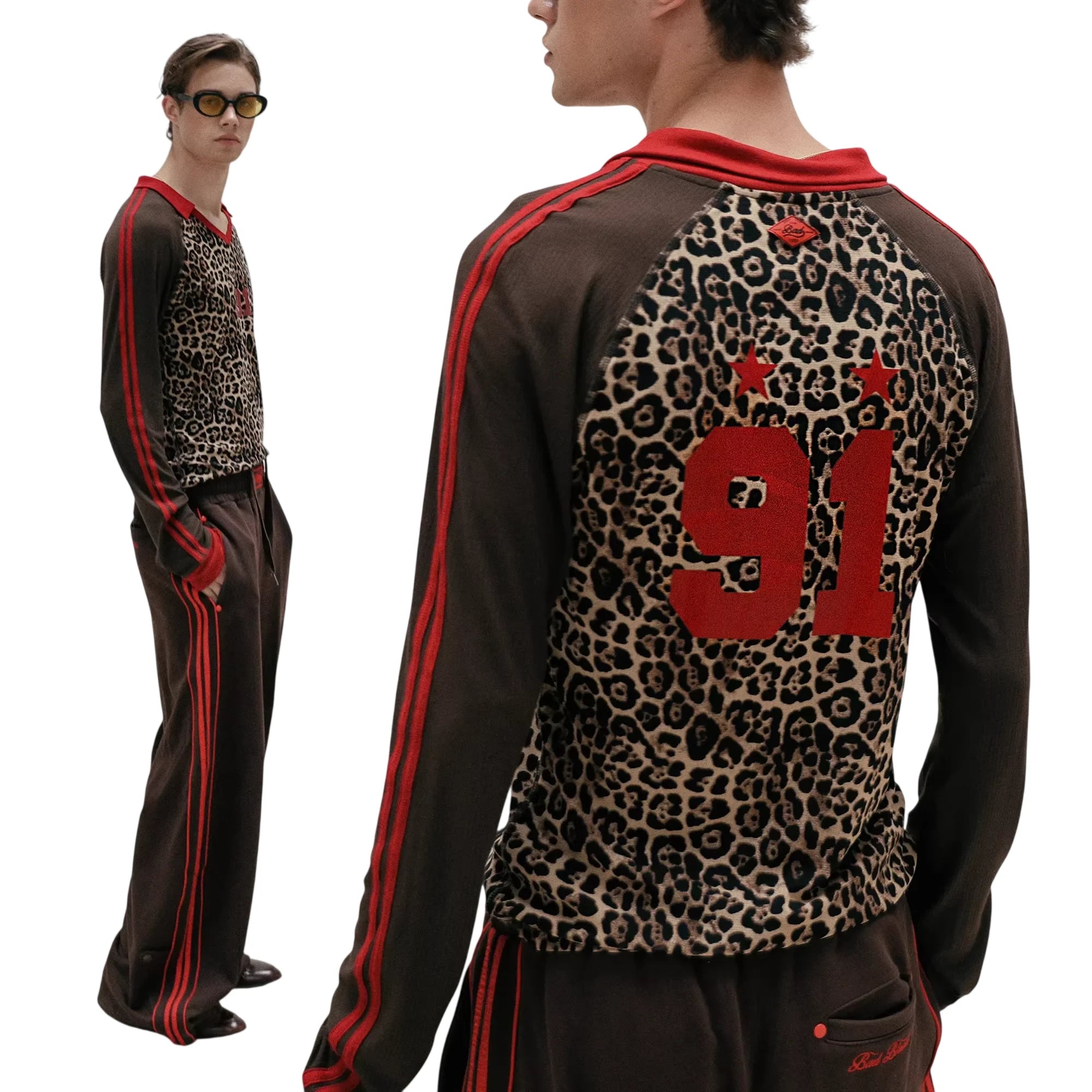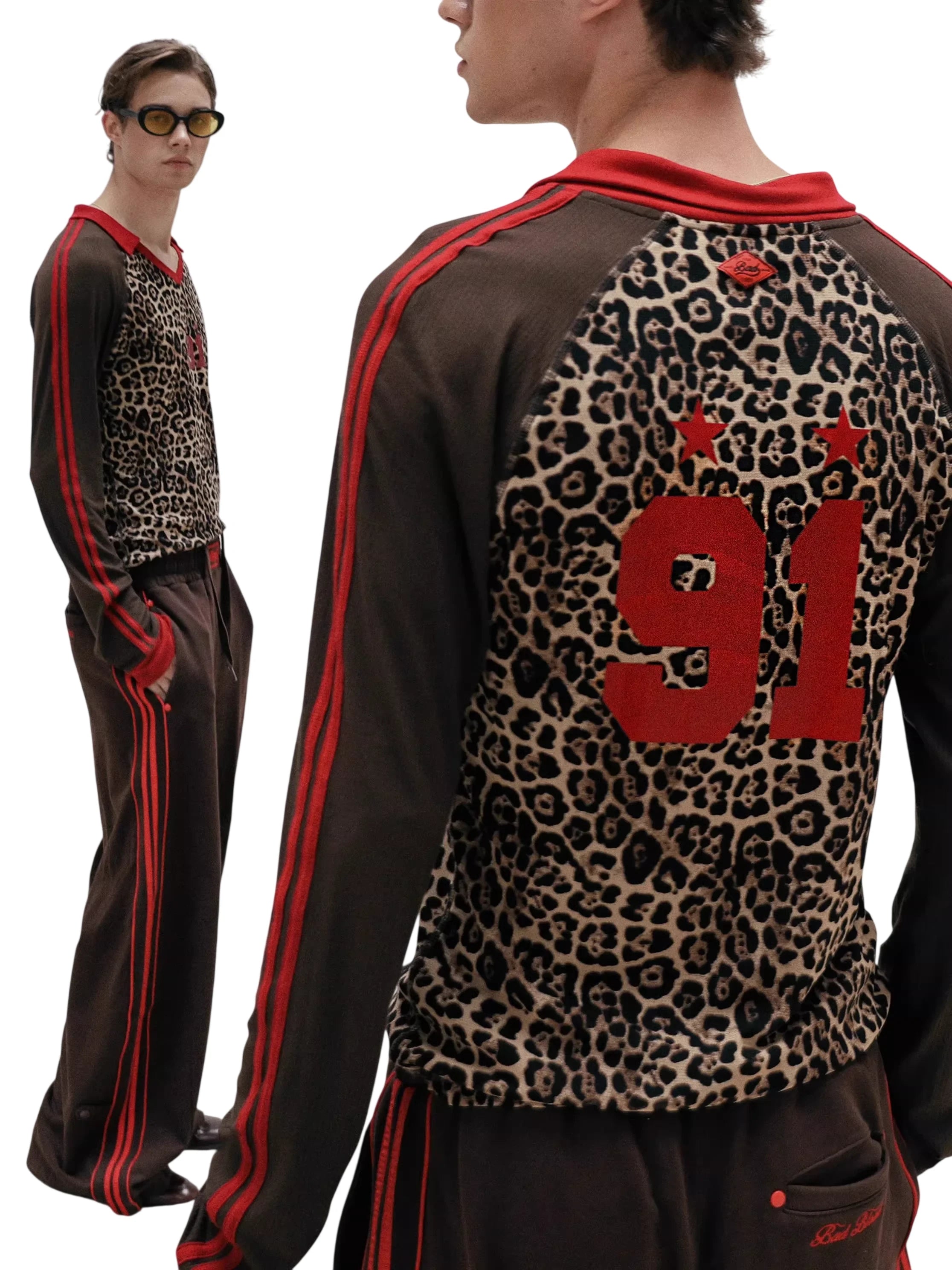 Embrace bold retro-inspired style with this unisex long sleeve sweatshirt. Featuring a striking leopard print design across the chest and back, this lightweight top is enhanced by vivid red stripes running down the sleeves and a prominent red '91' with star graphics on the back. Designed with a relaxed fit, it brings an athletic edge to everyday wear and pairs effortlessly with coordinating trousers for a cohesive look.