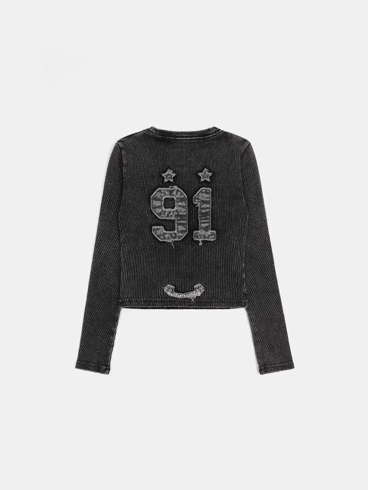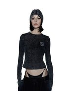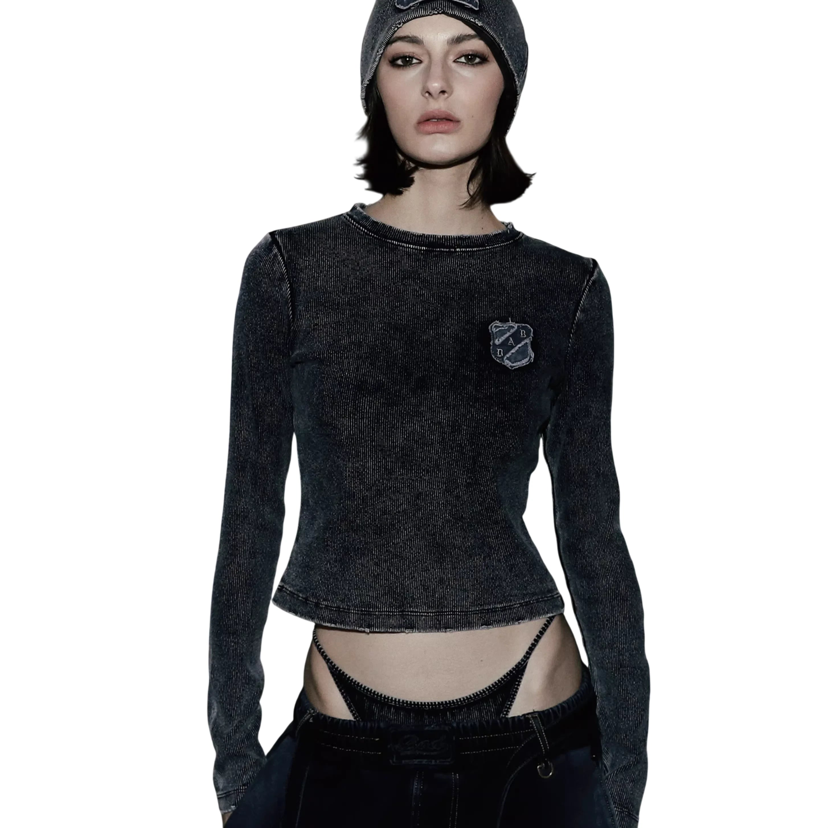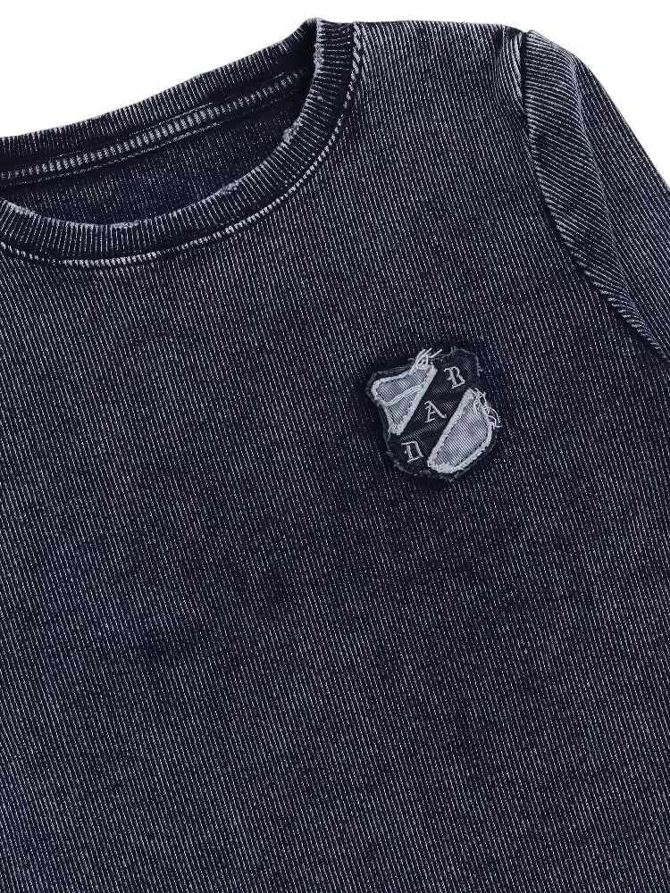 Make a bold statement with this women's long sleeve crop top, crafted from dark-wash denim or denim-like fabric. Featuring a slim fit silhouette, raw hem detailing, and a small embroidered crest patch on the chest, this top blends edgy design with urban style. Perfect for creating a grunge-inspired look, it pairs effortlessly with low-rise denim or layered streetwear essentials.