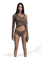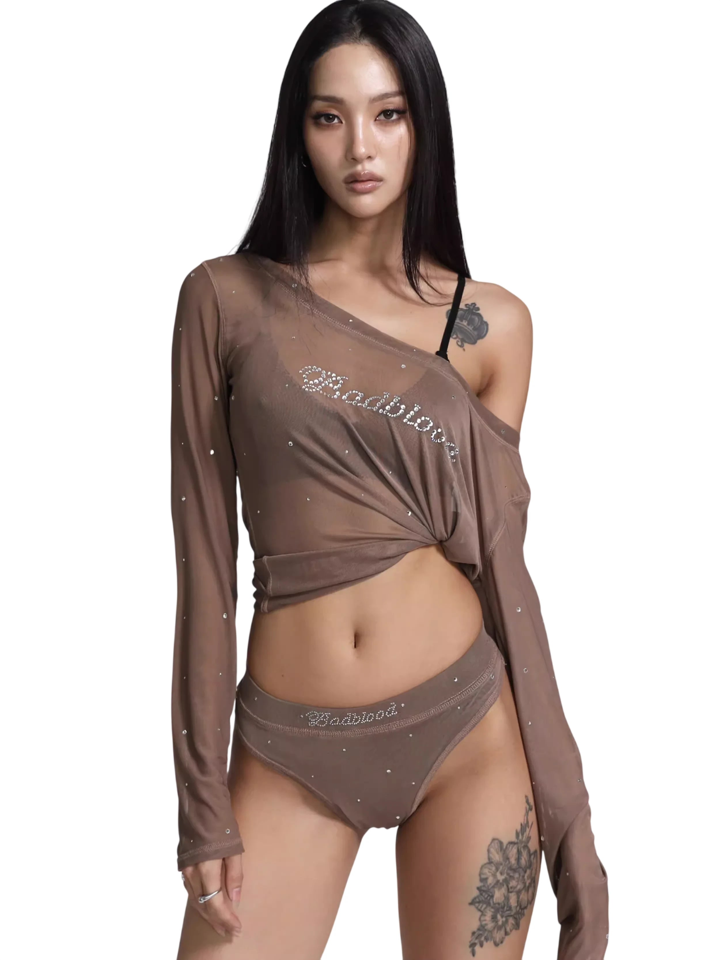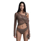 This women's long sleeve top features a sheer mesh design with an alluring off-shoulder neckline and knotted front detail. Embellished with rhinestones for a sparkling effect, the top offers a bold, fashion-forward look ideal for dance performances or stylish nights out. The semi-transparent material and asymmetrical design add an edgy twist, making it a standout piece in any wardrobe.