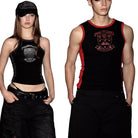 This women's athletic tank top features a bold two-tone design with striking red side panels and contrast trim around the neck and arms, set against a solid black base. The front showcases a large crest-style graphic in red, incorporating the phrases 'POWER OF NERV' and 'BADBLOOD' along with symbolic iconography. Crafted from stretchable material, this sleeveless top offers comfort and flexibility, making it an ideal choice for both active and casual wear.