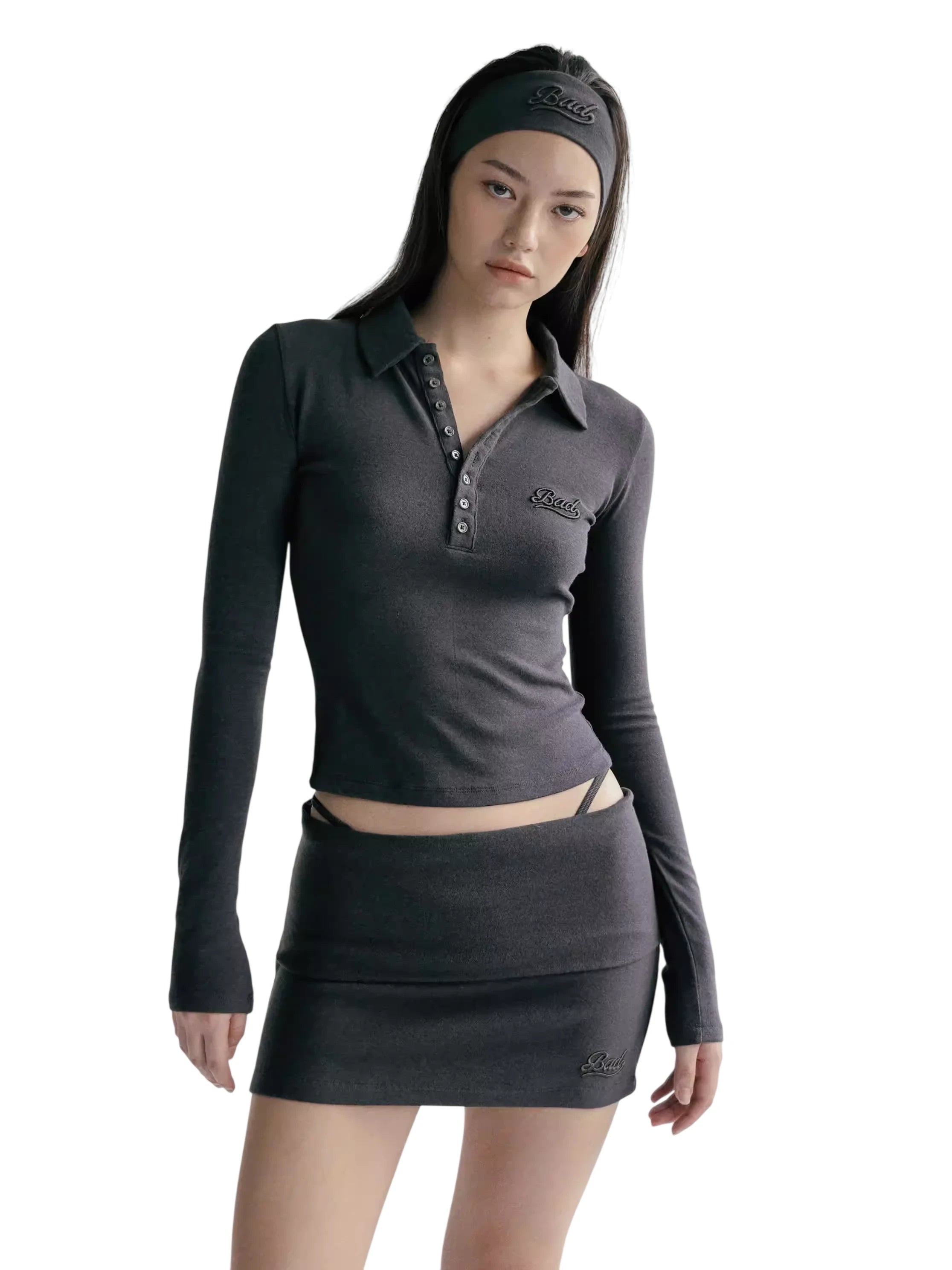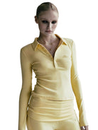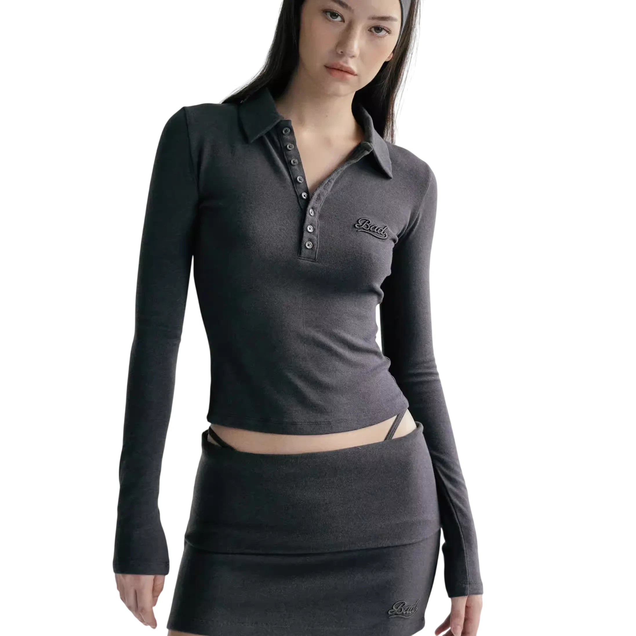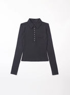This women's slim fit long sleeve polo shirt offers a sleek and modern silhouette, perfect for stylish everyday wear. Featuring a soft-touch fabric, it includes a collared neckline with a partial button placket and subtle embroidered detailing on the chest. Pair it with skirts or trousers for a versatile, coordinated look.