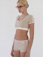 This women's two-piece set features a sporty and stylish design, perfect for summer lounging or casual activewear. The cropped short sleeve top includes a scooped neckline, button-front detail, and contrasting white trim for a fresh, athletic look. Coordinating high waist shorts offer a snug, comfortable fit with side stripes and matching waistband detailing to complete the ensemble. Ideal for staying cool and fashionable during warm weather.