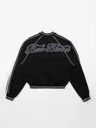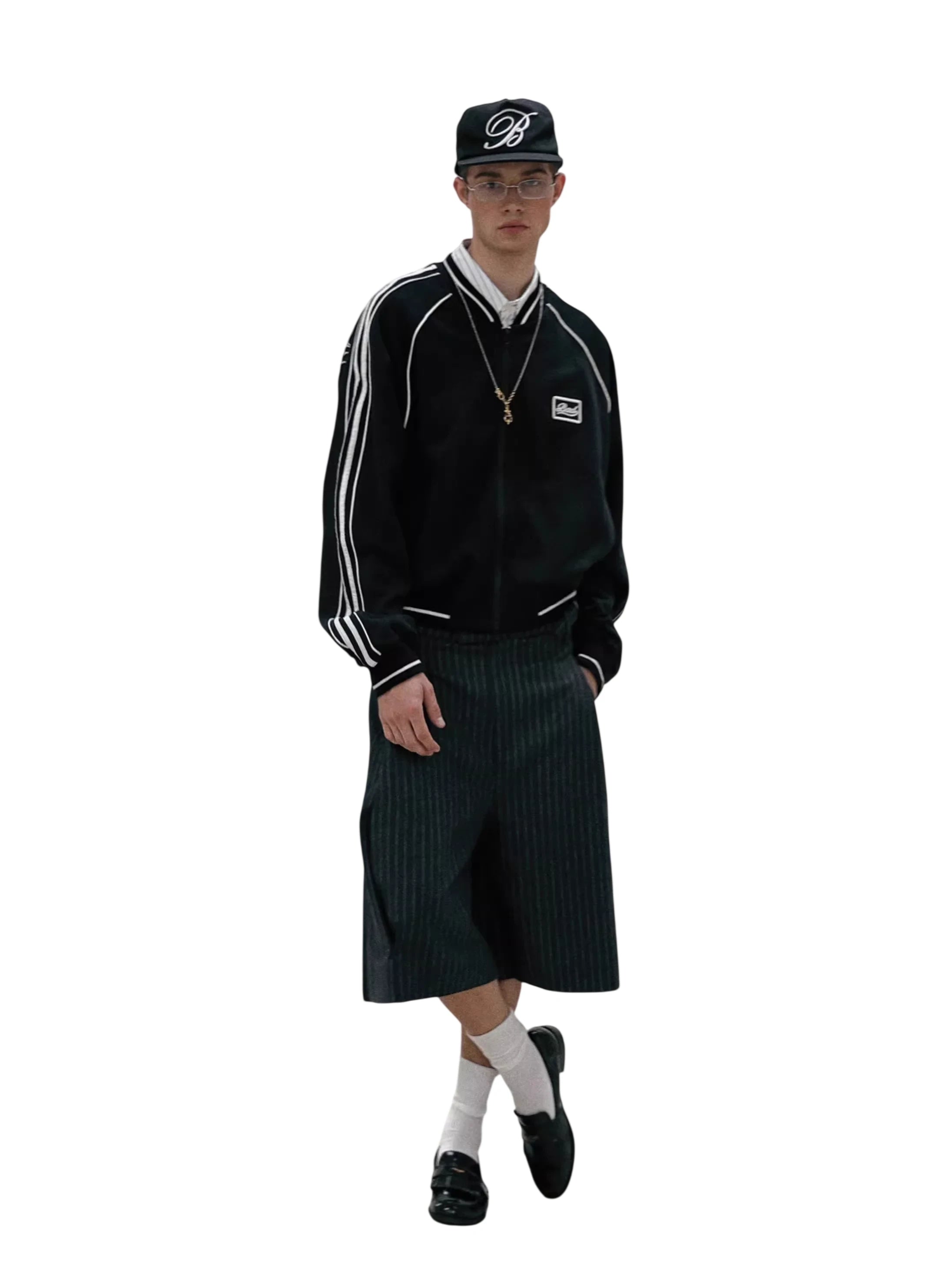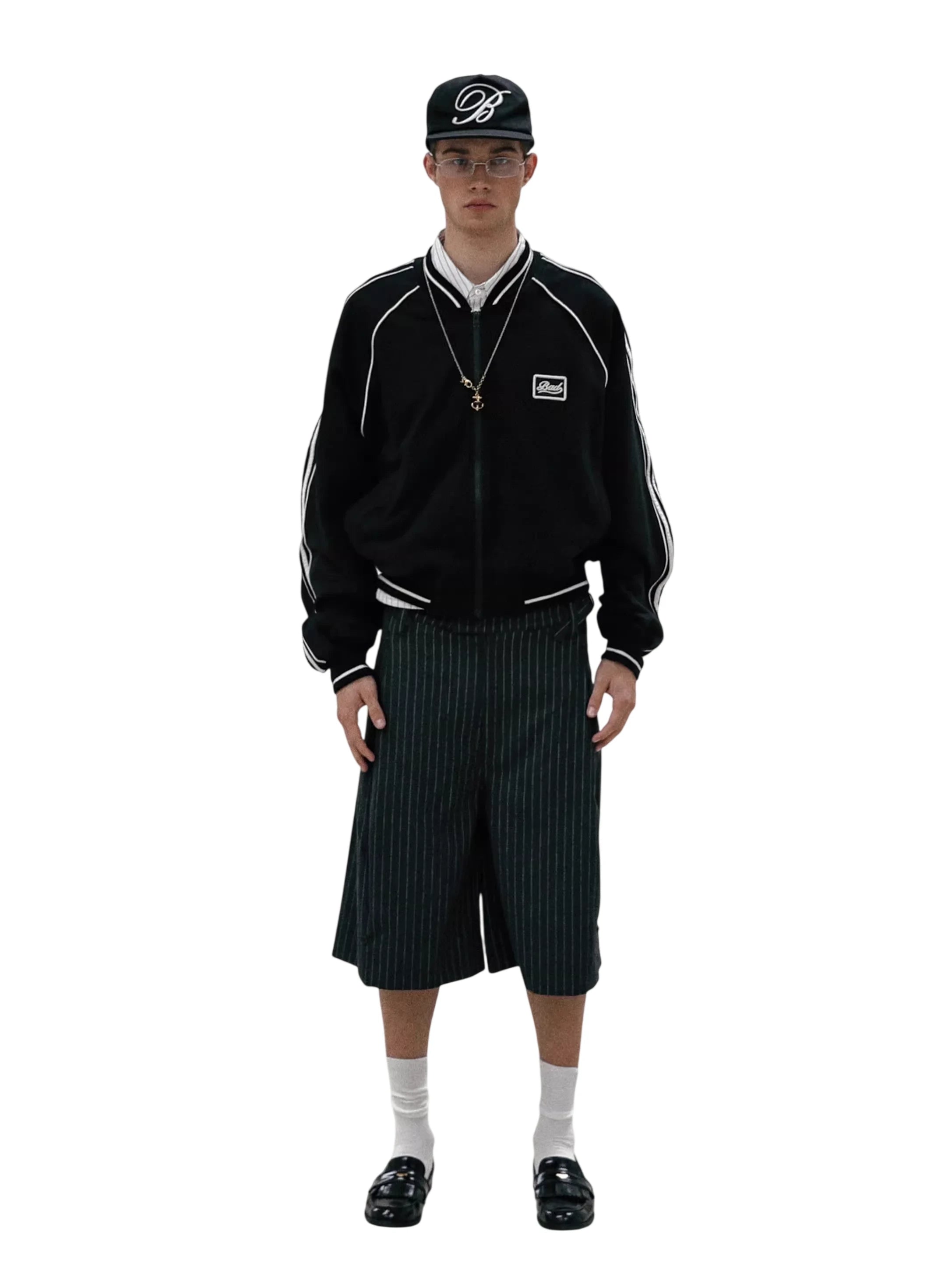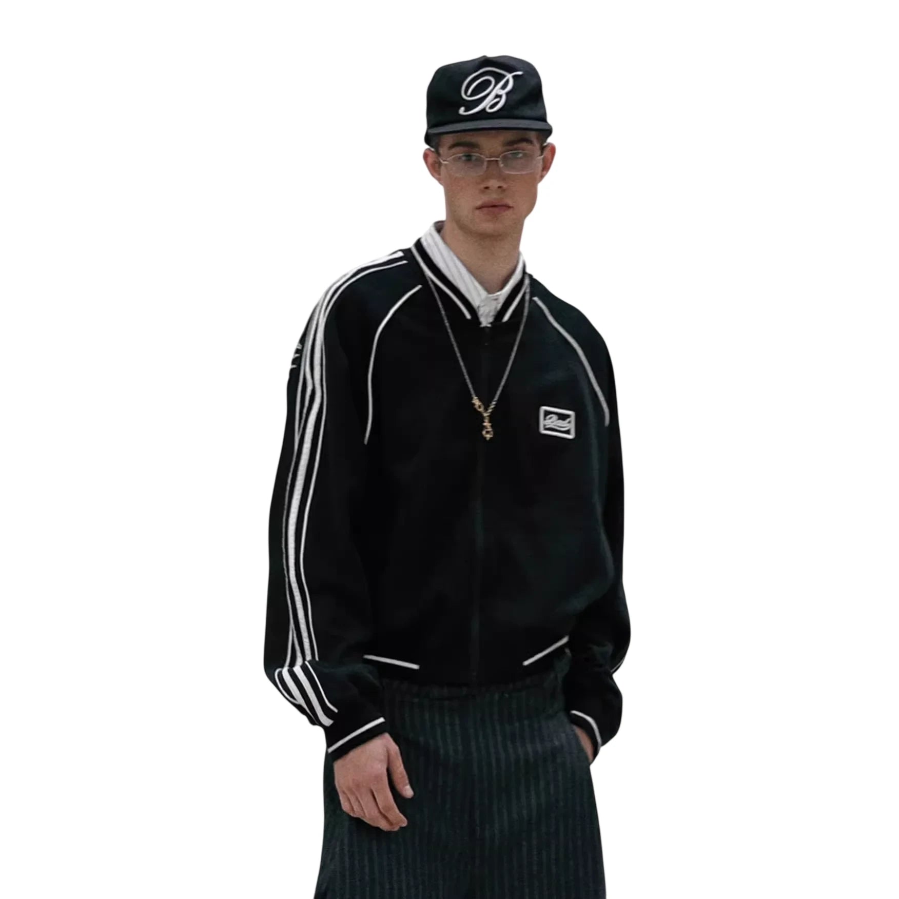 Elevate your streetwear look with this unisex summer sports jacket, designed for both style and comfort. Made with a lightweight zip-up construction, it features bold side stripes and contrast piping along the sleeves and seams for a dynamic appearance. A chest logo patch adds a subtle sporty touch, while the relaxed fit makes it perfect for layering. Styled here by a male model, it's paired effortlessly with dark striped trousers and accessories for a contemporary urban vibe.