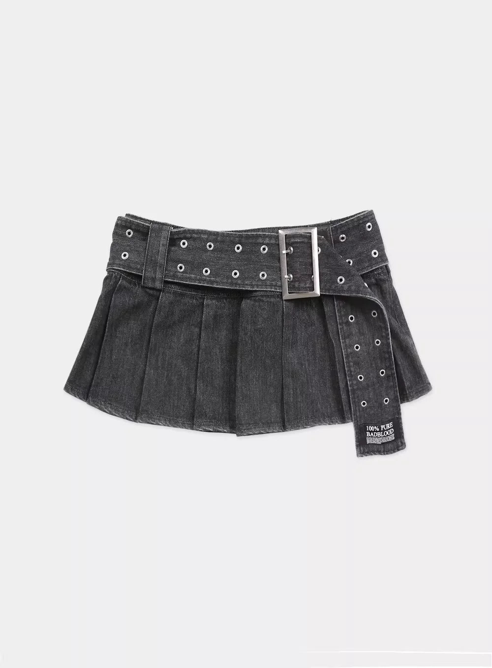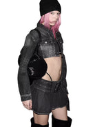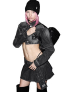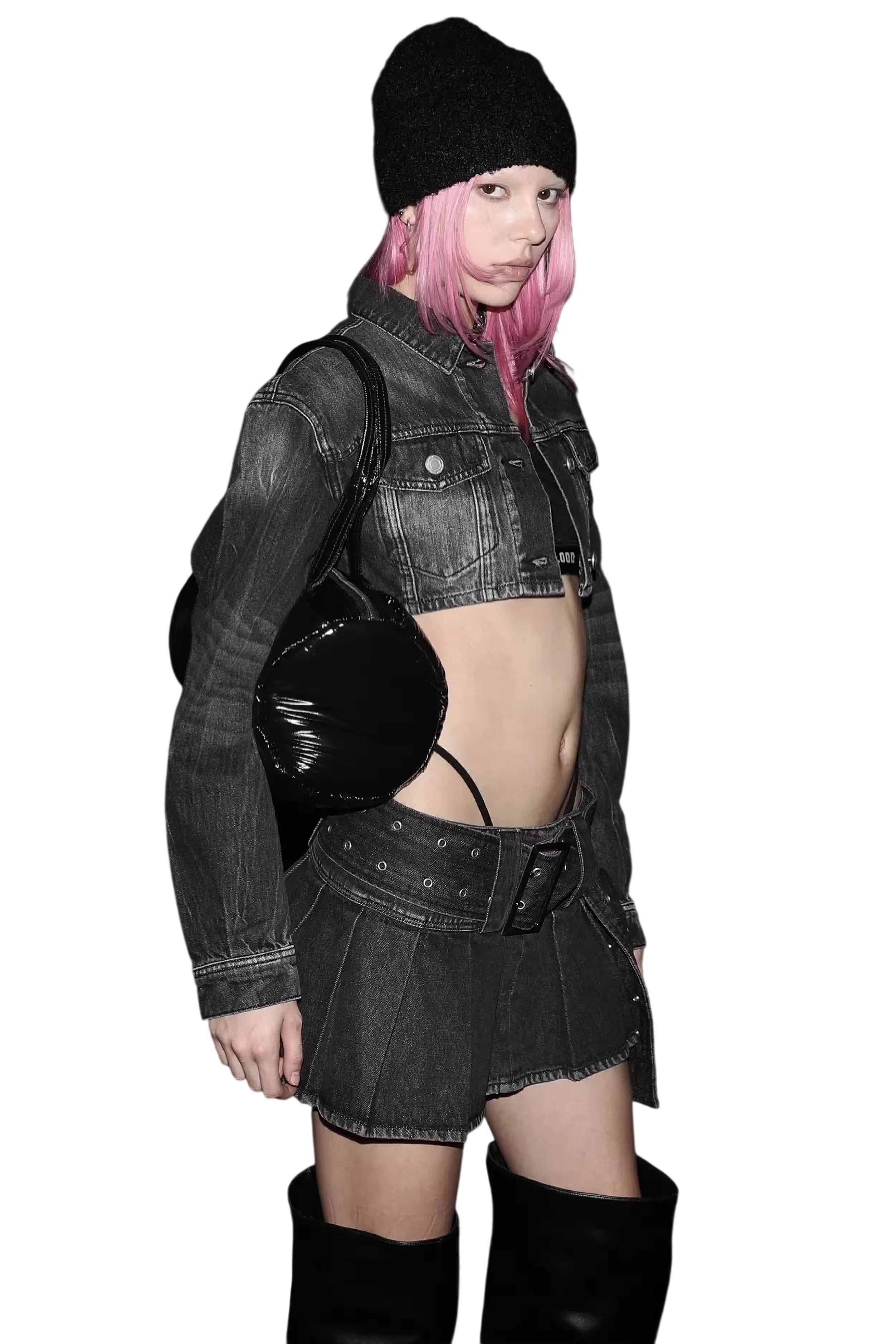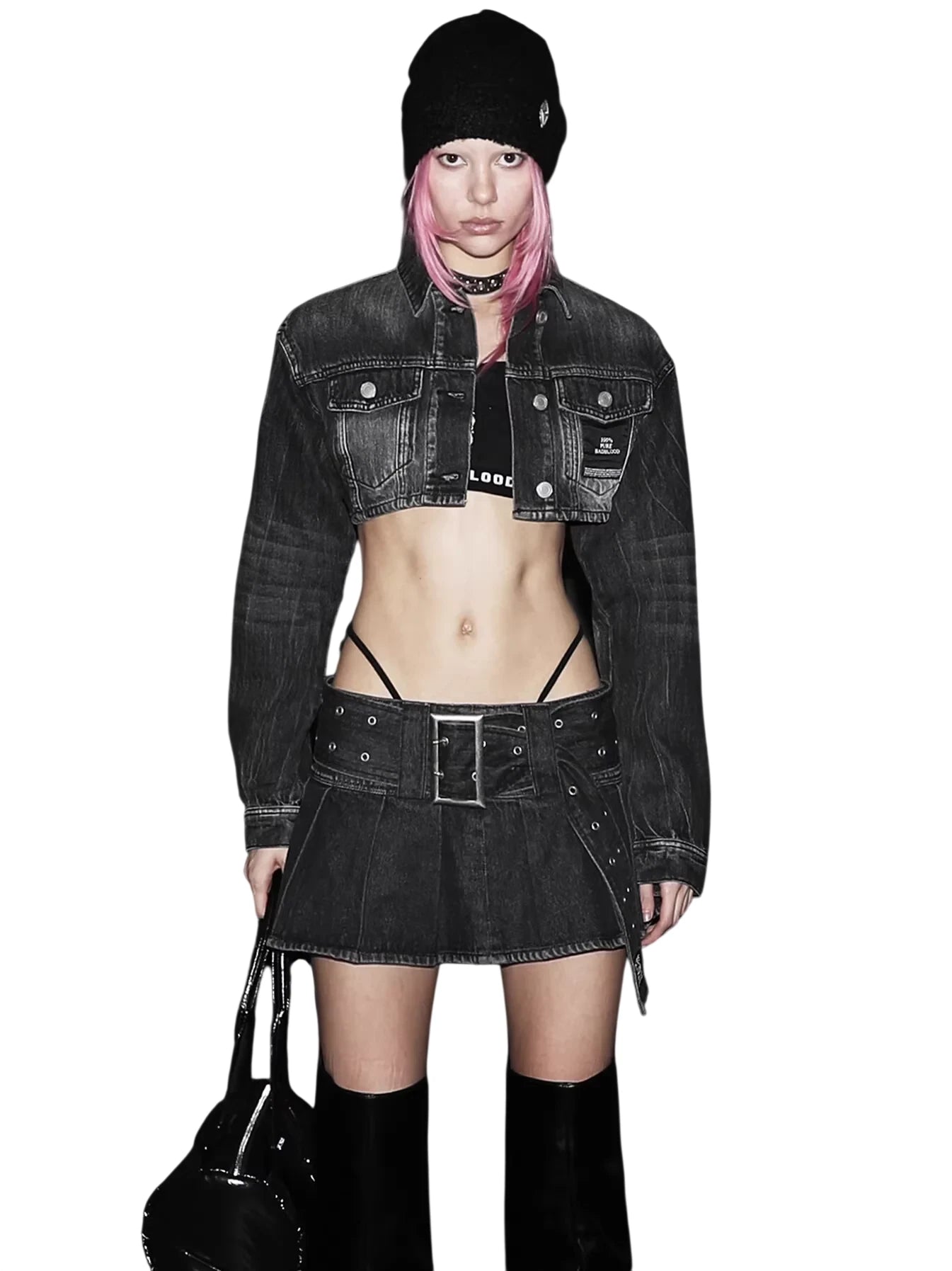 Make a bold fashion statement with this edgy two-piece set designed for the modern woman. The outfit includes a cropped black denim jacket with silver button closures and defined seam detailing, perfectly paired with a high-waisted mini skirt featuring sharp pleats and a wide belt accentuated by grommet holes and a prominent rectangular buckle.