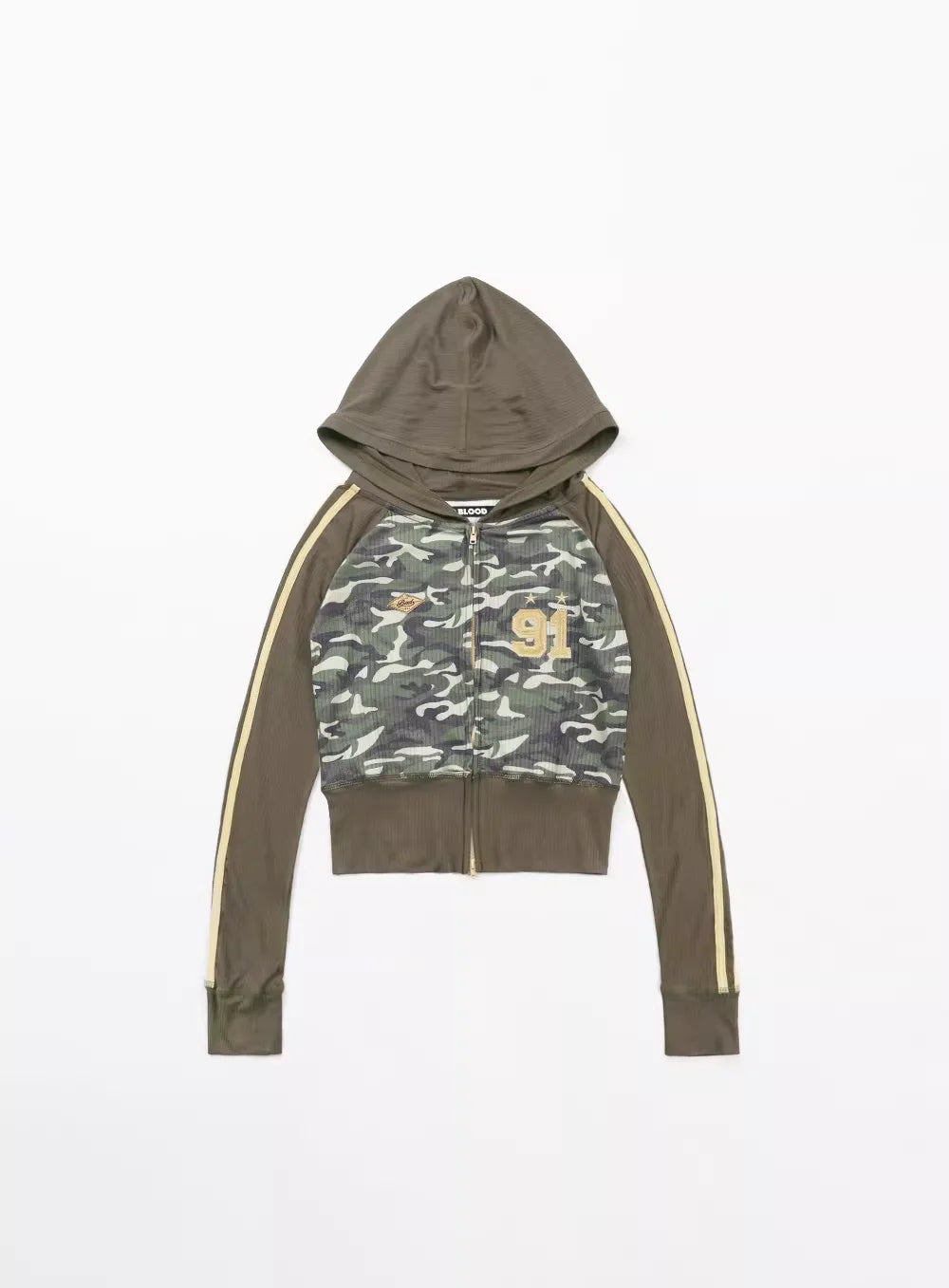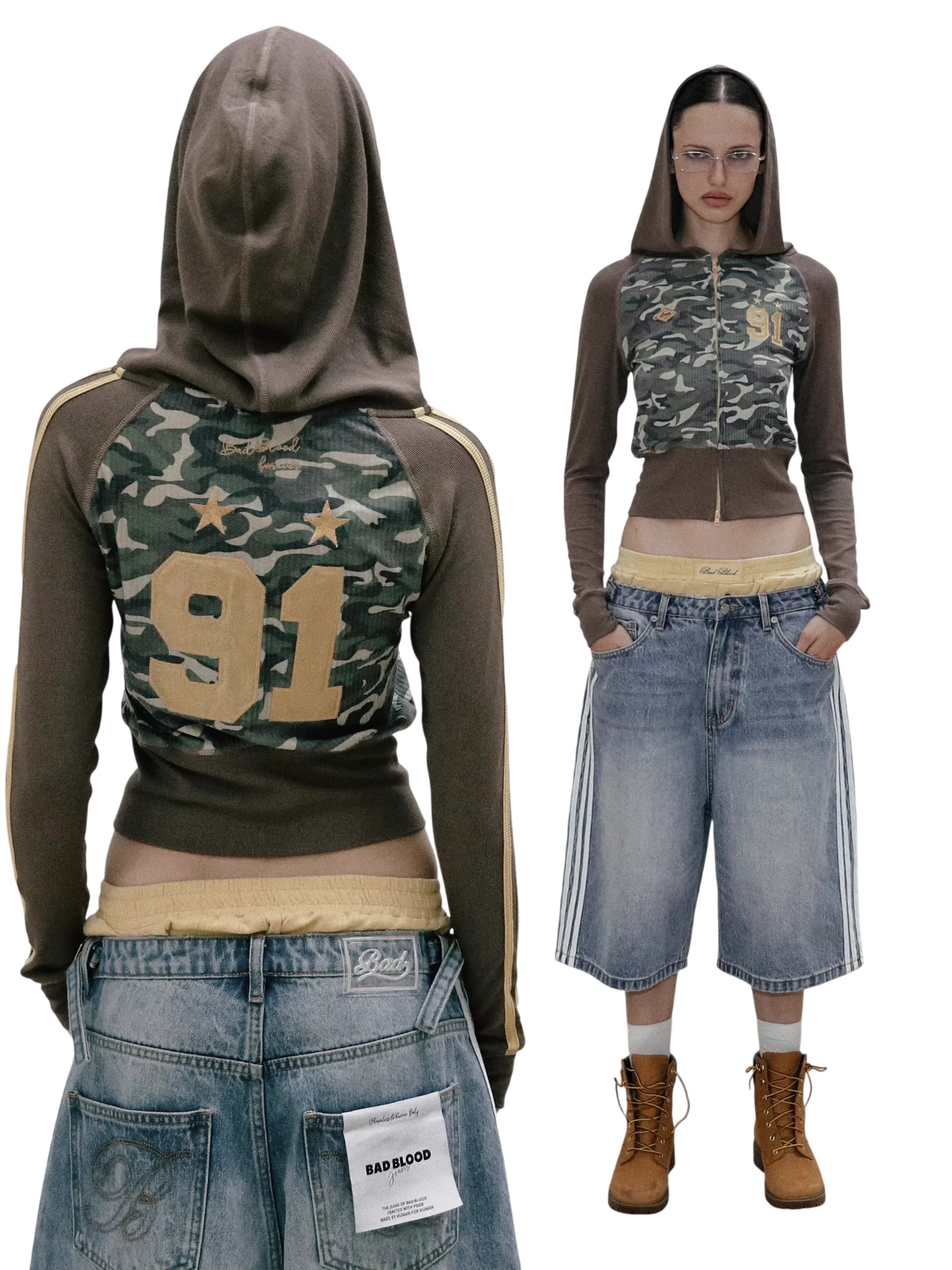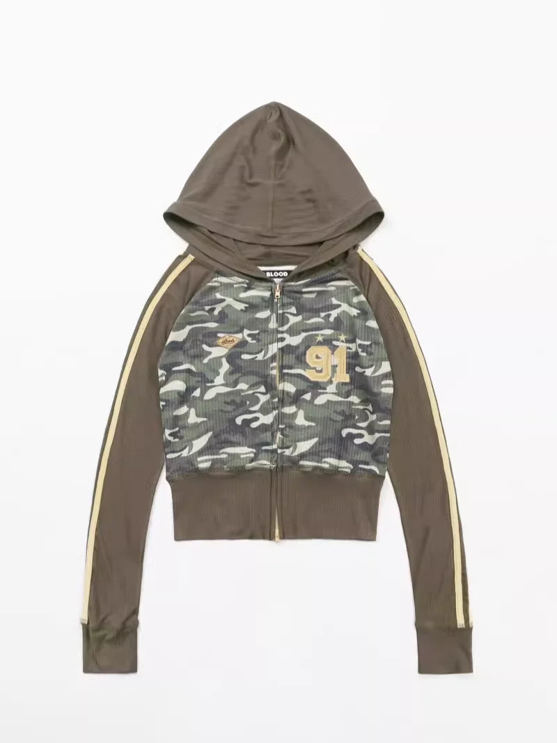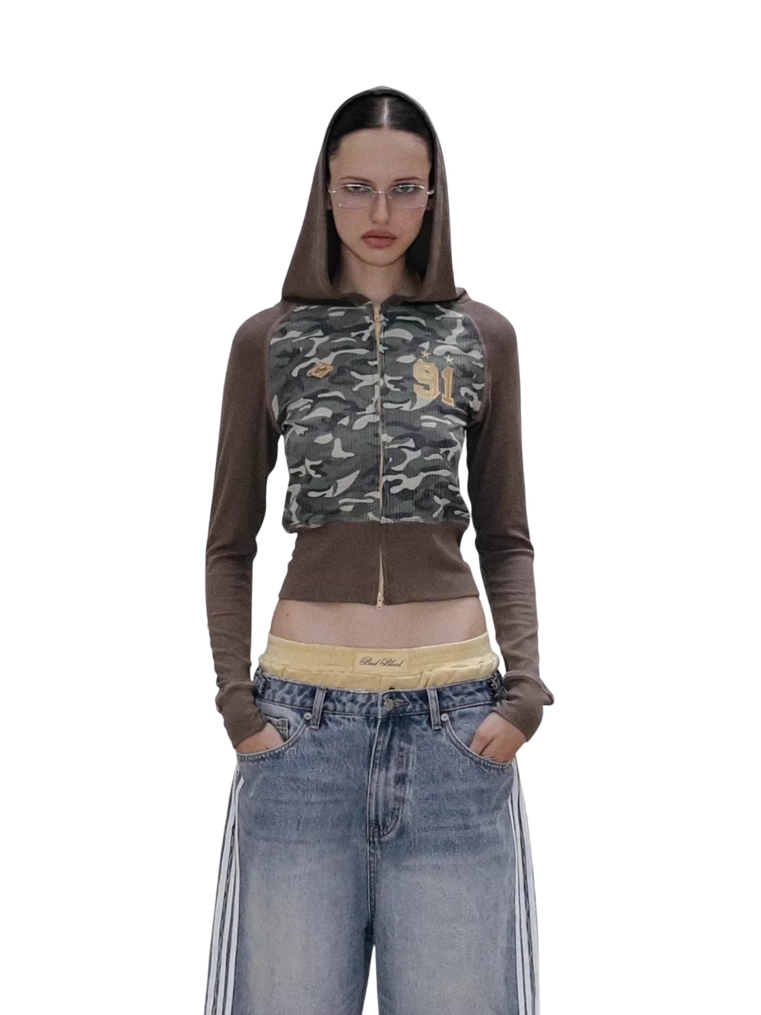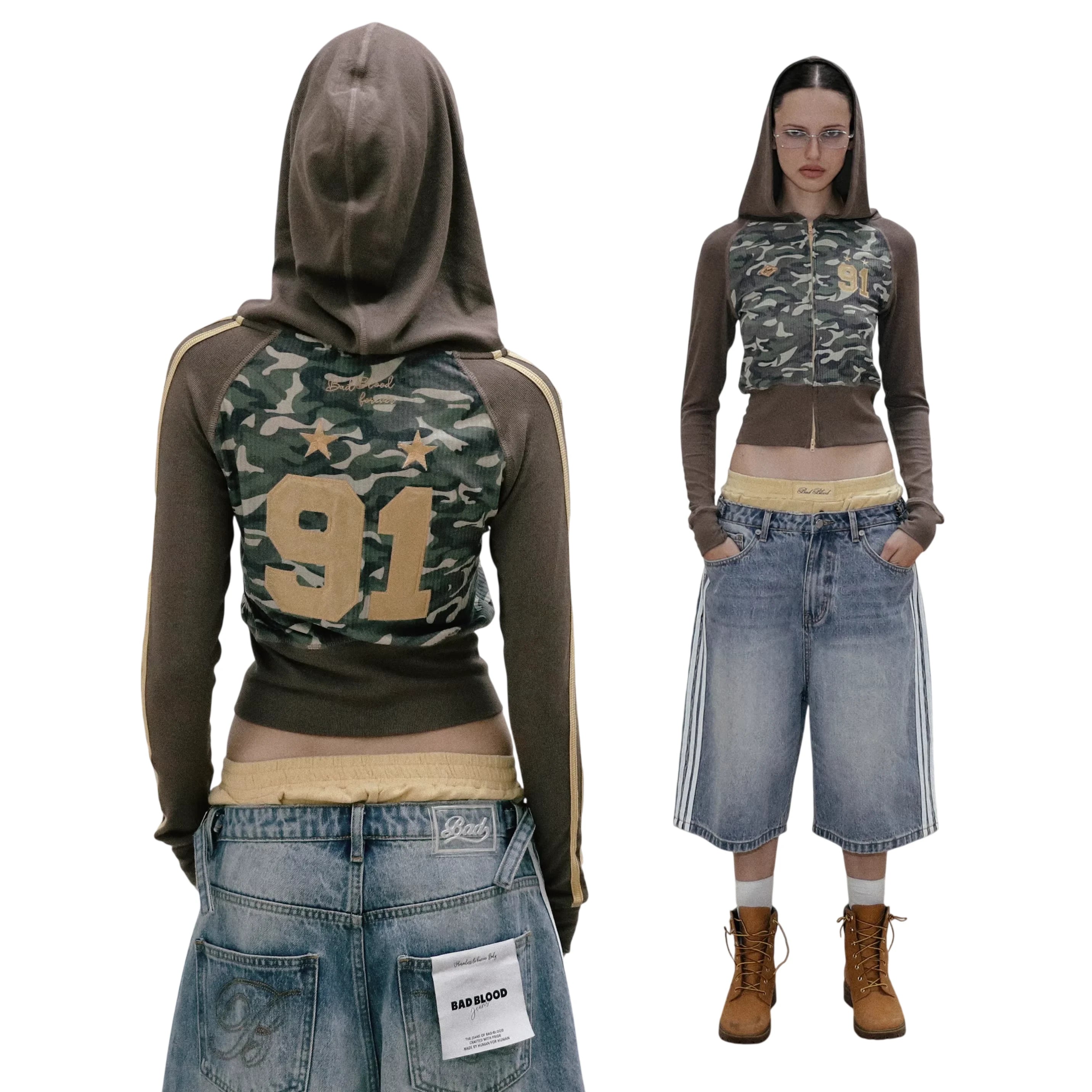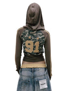 Step into bold streetwear fashion with this women's cropped hooded jacket, featuring a striking camouflage print and eye-catching gold '91' graphics on both the front and back. The jacket includes deep brown sleeves with contrasting gold stripes for a sporty edge. Designed in a retro-inspired, American street style, this zip-up sweatshirt combines comfort and statement-making flair, perfect for cooler autumn days.