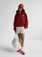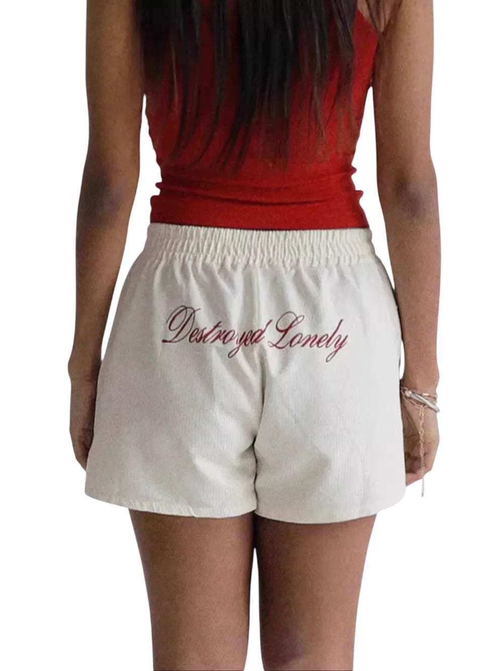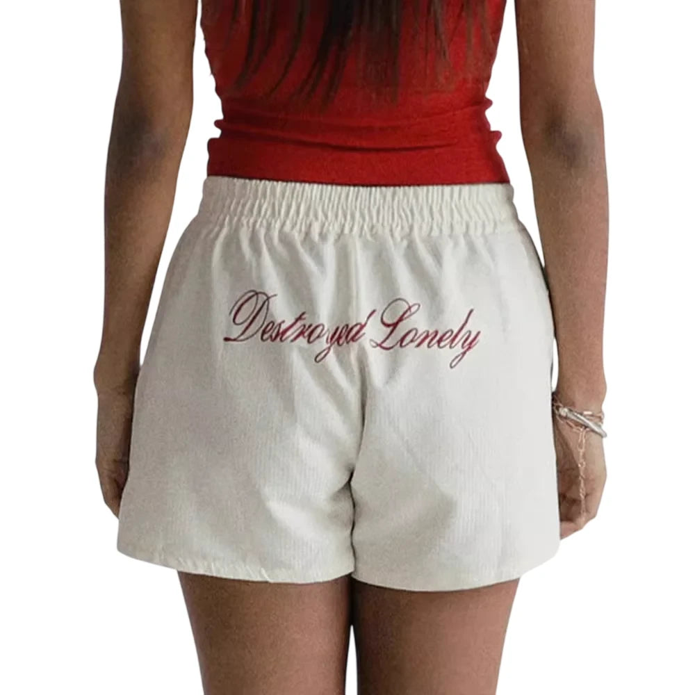 Stay stylish and comfortable this summer with these women's embroidered retro sports shorts. Designed with a relaxed, wide-leg fit and mid-thigh length, these shorts feature a soft elastic waistband for easy wear. The back showcases bold cursive embroidery reading 'Destroyed Lonely' for a unique, standout look. Ideal for casual outings, workouts, or lounging.