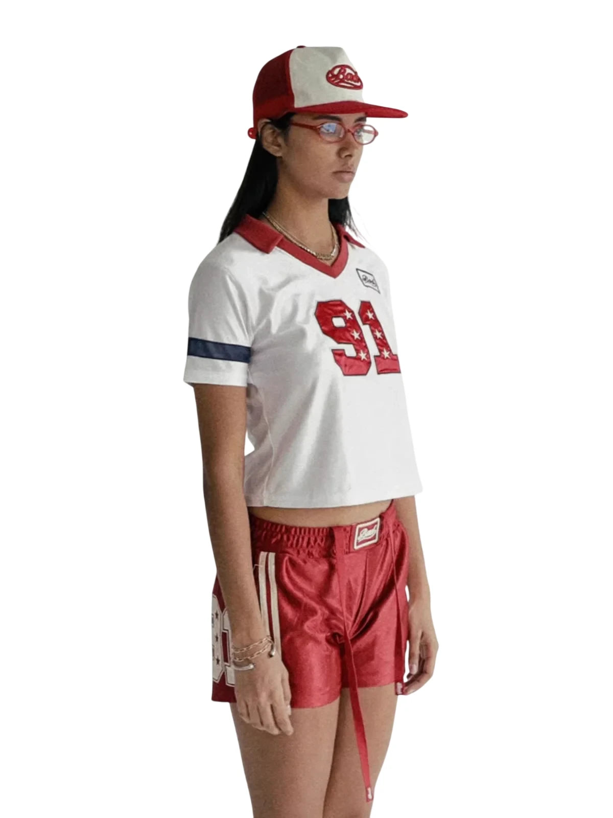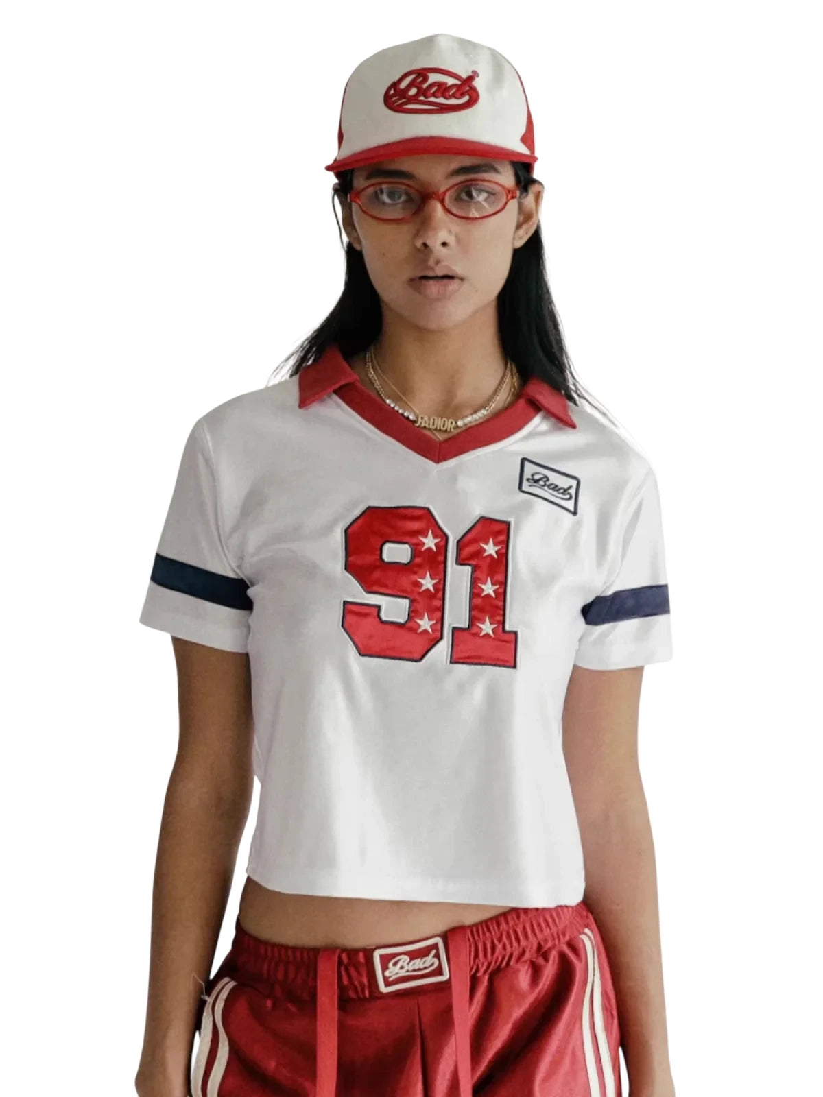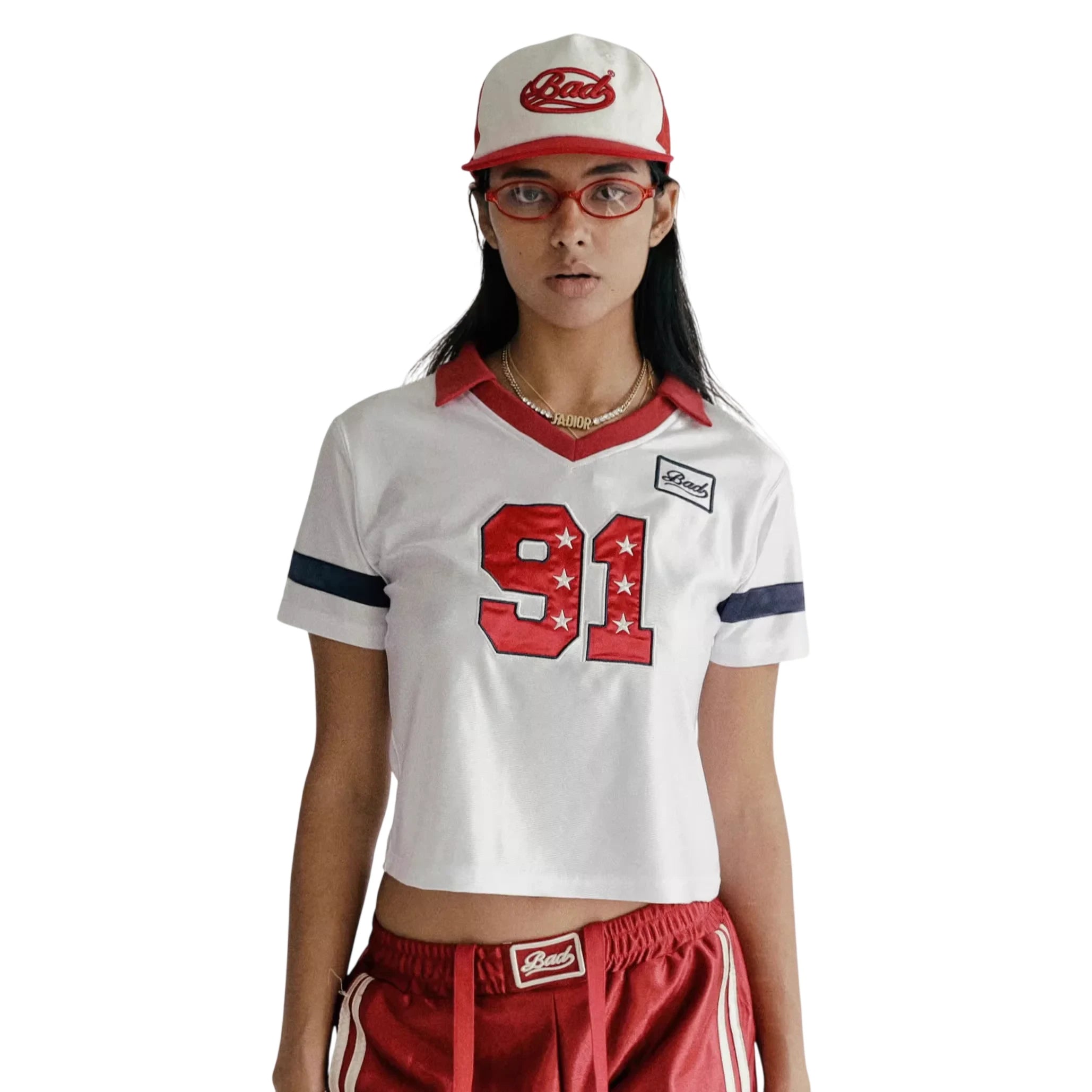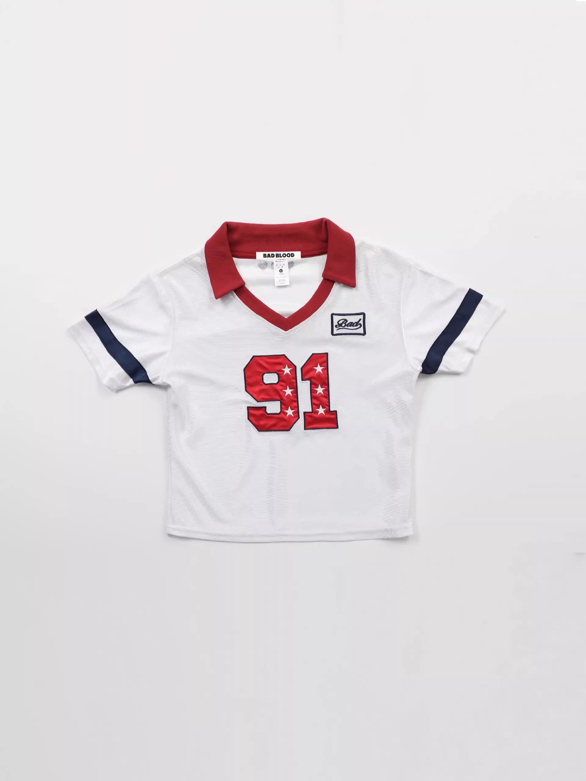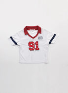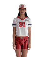 This women's retro-inspired baseball jersey crop top blends classic athletic style with a fashionable modern twist. Featuring a white short-sleeve design, V-neckline, and a turn-down collar in bold red, the top showcases sporty navy blue sleeve stripes and a prominent red '91' graphic accented with stars. Additional graphic patches add an authentic vintage sports vibe. Perfect for casual wear or street-style outfits, this cropped top pairs effortlessly with athletic shorts or jeans for an urban sporty look.