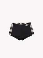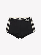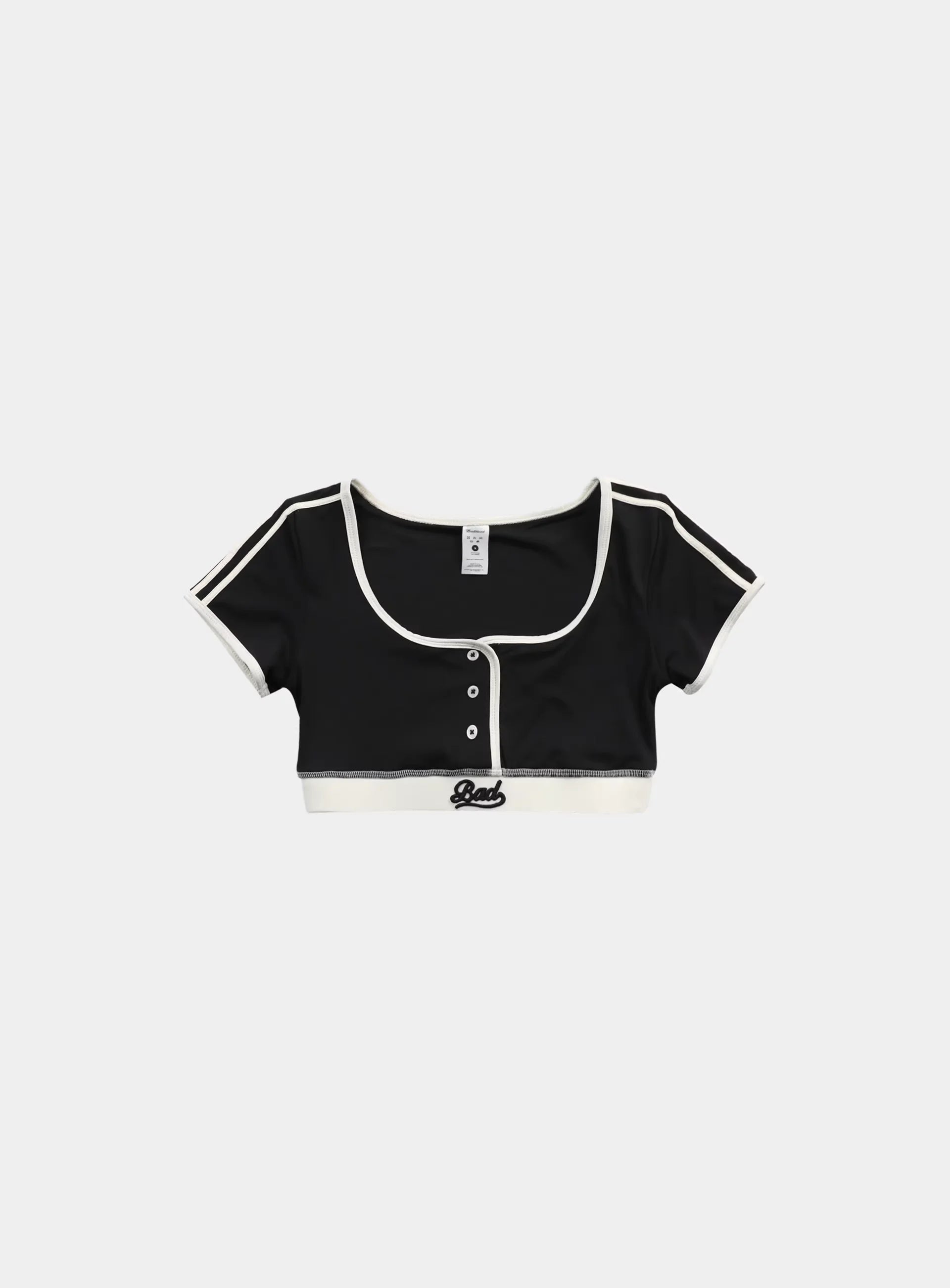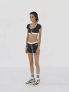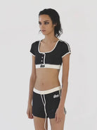 Elevate your casual wardrobe with this women's summer sporty two-piece set, perfect for lounging or light activities. The set features a cropped short-sleeve button-down top with a flattering scoop neckline and distinctive embroidered text detail near the hem. The coordinating high-waisted shorts include a comfortable drawstring waist, contrast white side stripes, and matching embroidery on the front. Designed in classic black with white accents, this ensemble offers a modern athletic look ideal for warm-weather style.