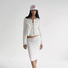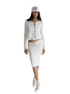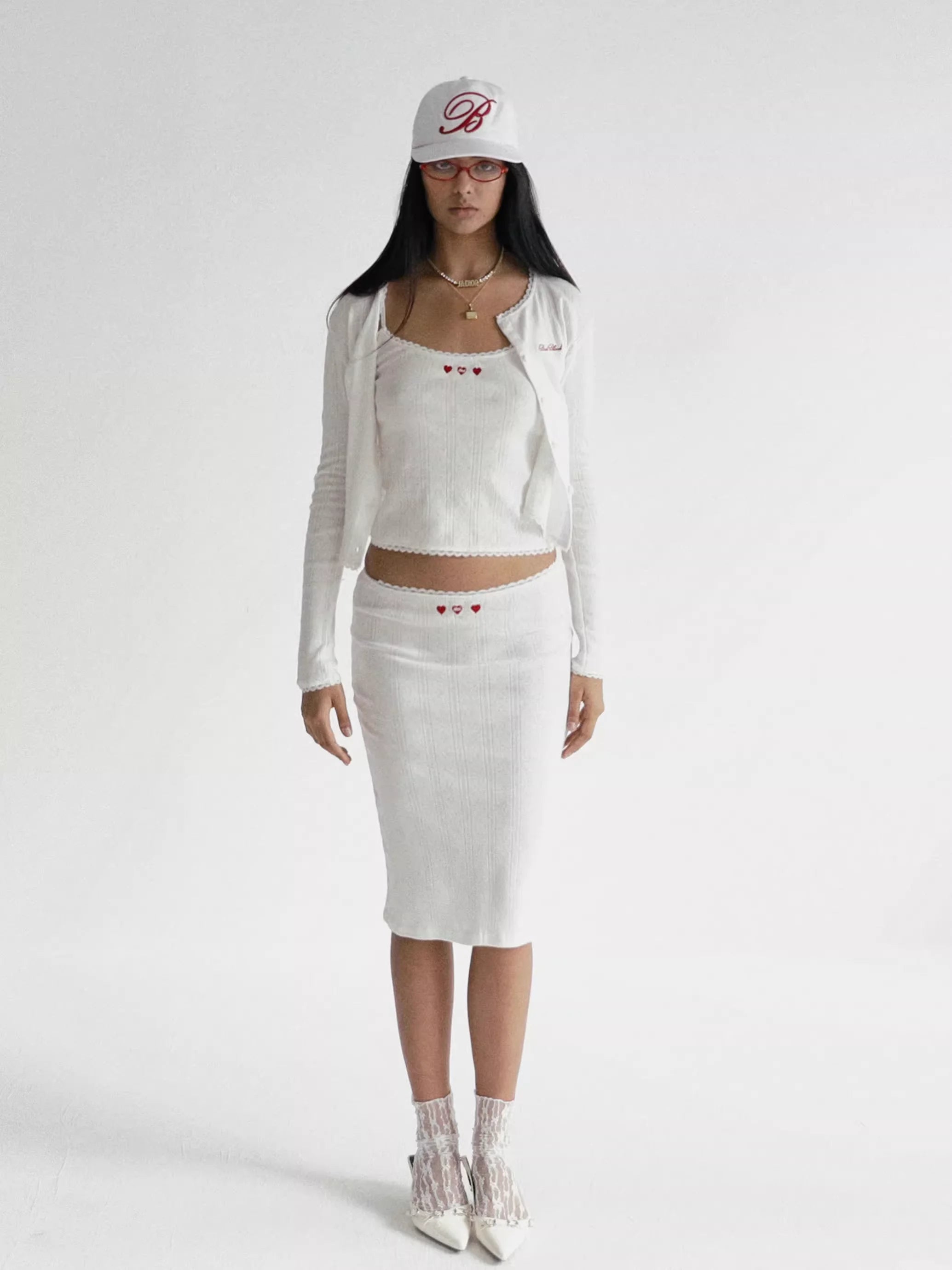 Elevate your autumn wardrobe with this Y2K-inspired three-piece set for women, featuring a ribbed camisole with delicate lace trim, a matching high-waisted pencil skirt, and a cozy cardigan. The camisole and skirt are adorned with charming red heart prints, bringing playful detail to the coordinated outfit. The cardigan completes the look with embroidered text on the chest, adding a retro touch. Perfect for casual outings or layering in cooler weather, this set combines nostalgia and modern style effortlessly.