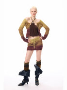The top is designed with a plunging V-neckline, drawstring tie detail, and thumb-hole sleeves for added flair. The coordinating mini skirt includes a drawstring waist finished with decorative bead accents, offering both style and adjustability.