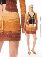 This stylish women's two-piece knit set features a fitted long-sleeve crop top paired with a matching high-waisted mini skirt. The soft mohair blend fabric showcases a rich gradient pattern transitioning through mustard yellow, olive green, and wine red hues.