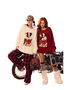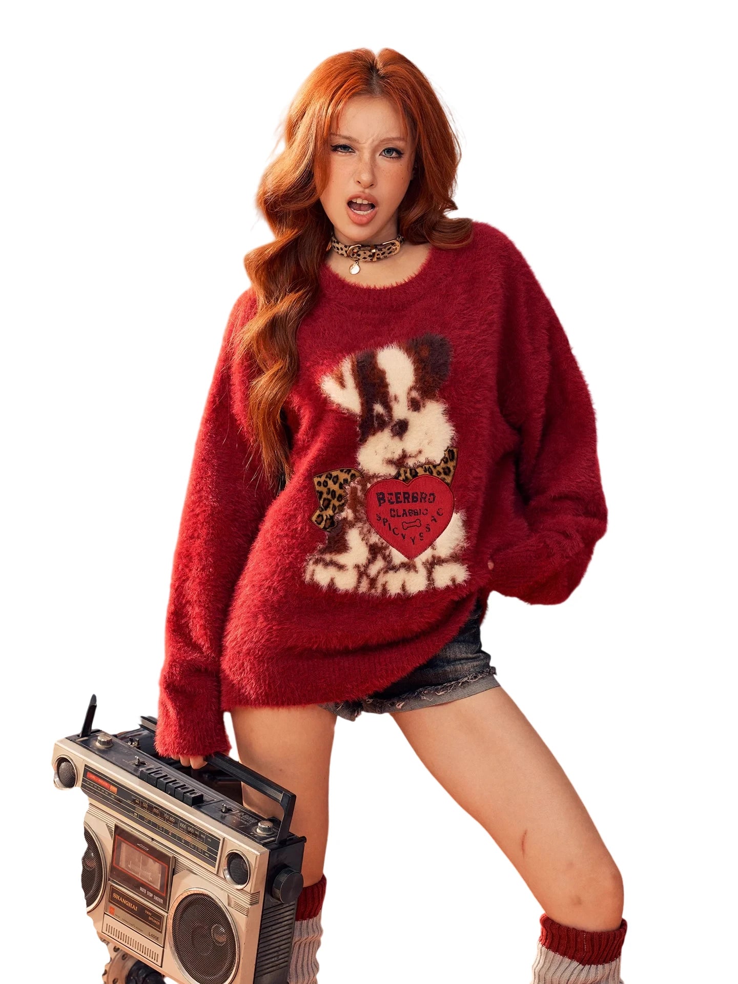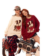 Stay cozy and stylish with this soft, skin-friendly faux mink sweater featuring an adorable cartoon dog design. Perfect for a playful yet casual look, this oversized knit showcases a jacquard puppy graphic accented by heart and bow details. Available in charming off-white and deep red shades, the sweater pairs well with casual bottoms and fun accessories. Ideal for women seeking both comfort and cuteness in their daily wear or outdoor outfits.