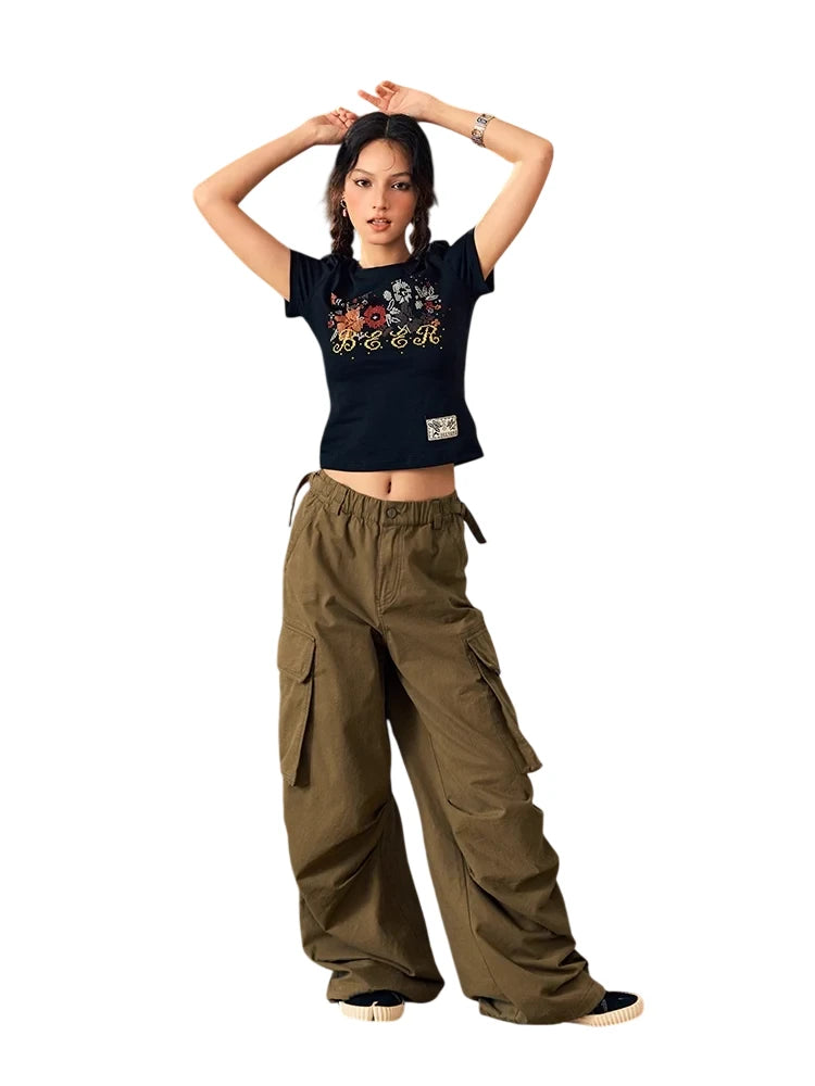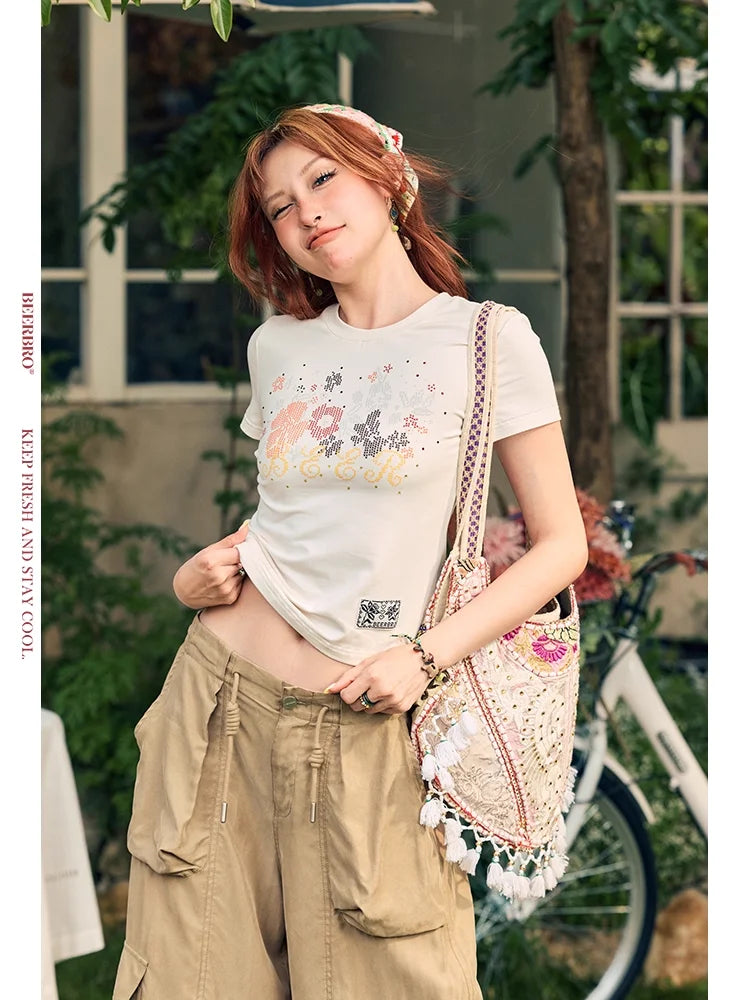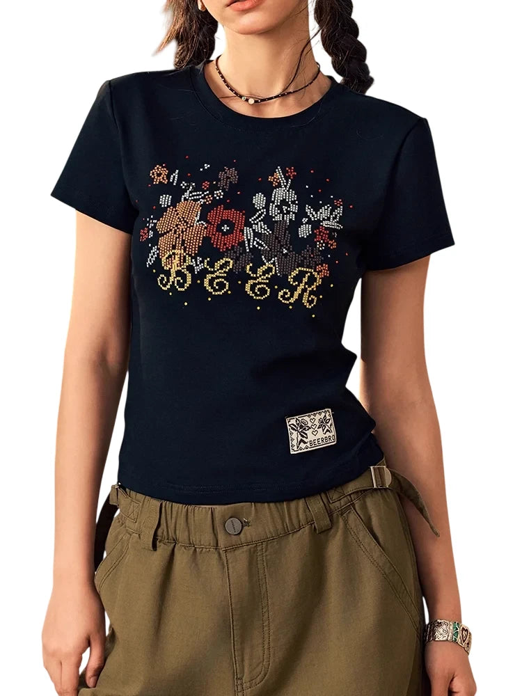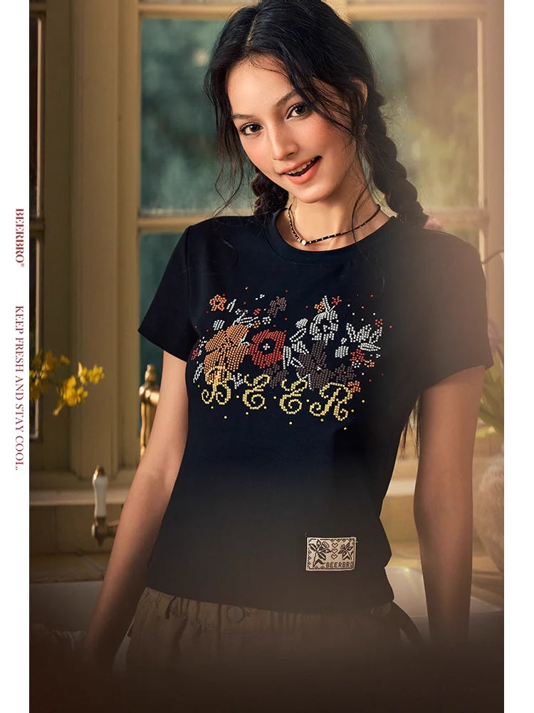 This stylish short-sleeved black T-shirt for women features a vibrant floral mosaic design across the chest, enhanced with rhinestone accents for added charm. The cross-stitch-inspired pattern includes rich tones of orange, red, brown, and white, with playful yellow swirls creating a fresh and artistic look. Made from soft, breathable material with a comfortable round neckline, it's perfect for summer wear. Ideal for casual outings, this tee combines comfort with a touch of creative flair.