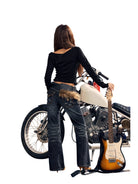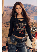 Make a bold fashion statement with this women's long sleeve T-shirt featuring a deconstructed, layered design and edgy halter-style neckline. The shirt showcases a striking glitter slogan print reading "Sassy and Fabulous 1960" in vibrant red, gold, and white tones, accented with star and lips graphics. Perfect for adding a touch of glam to your casual wardrobe, this standout top combines style and attitude effortlessly.