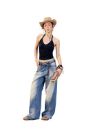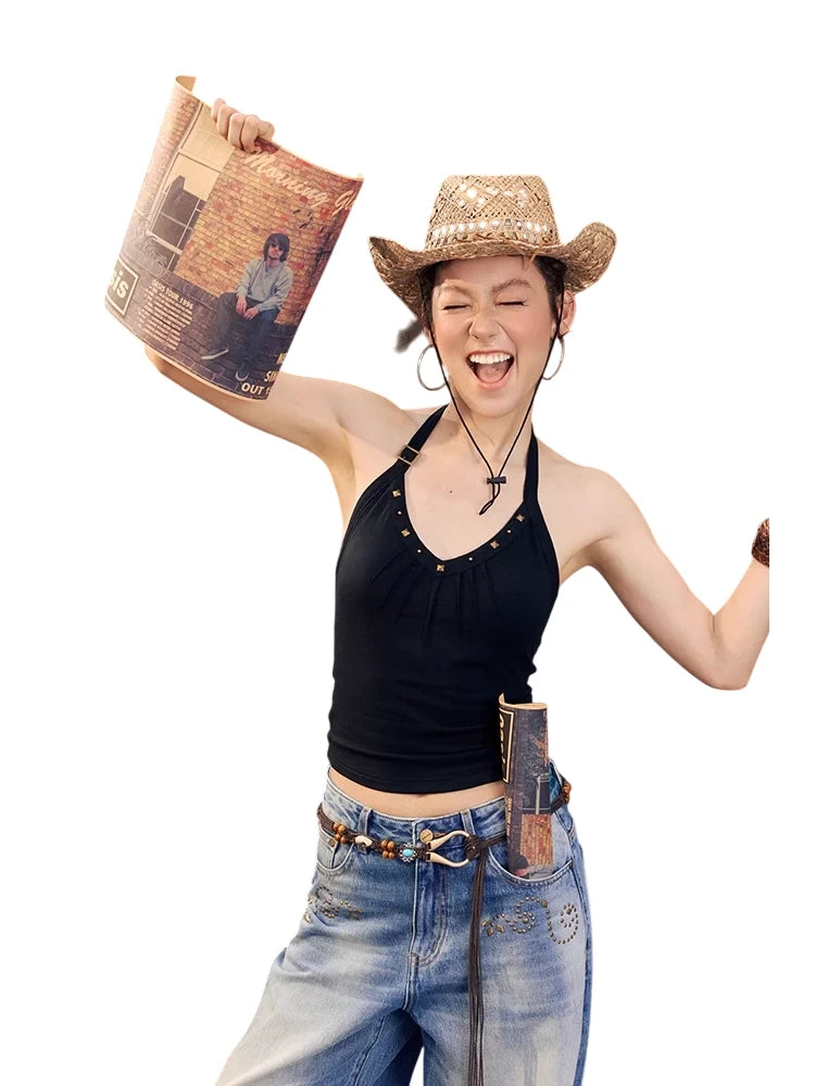 BeerBro Halter Neck Knit Tank Top with Beaded Straps and Studded Neckline