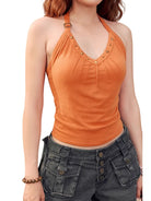 This stylish halter-neck knit tank top is designed for women seeking a chic and modern summer look. Featuring elegant beaded straps, subtle chest padding, and a neckline adorned with metallic studs, this top offers a perfect balance of glamour and comfort. The pleated detailing below the bust adds a flattering silhouette, making it ideal for casual outings or warm-weather adventures.