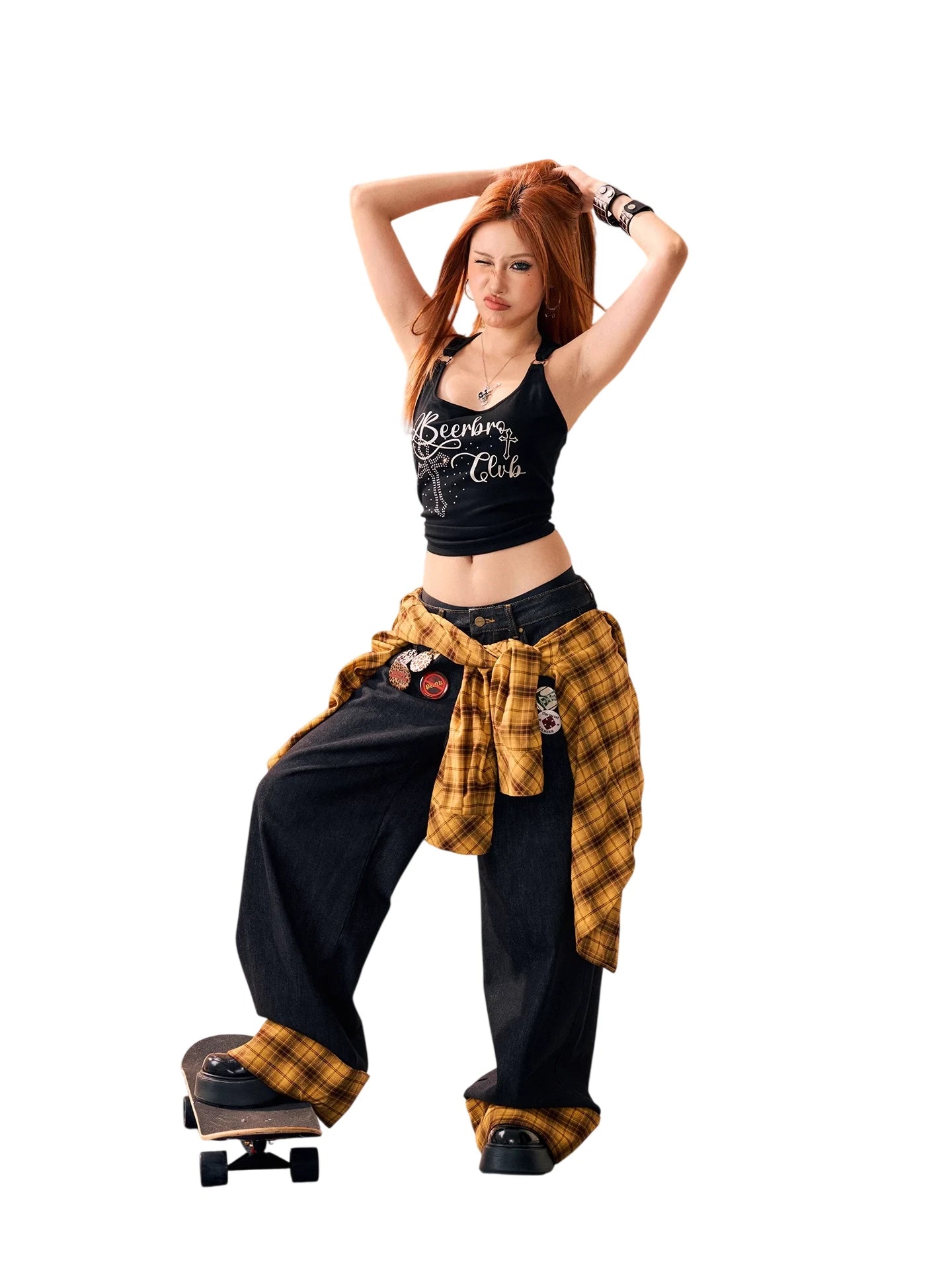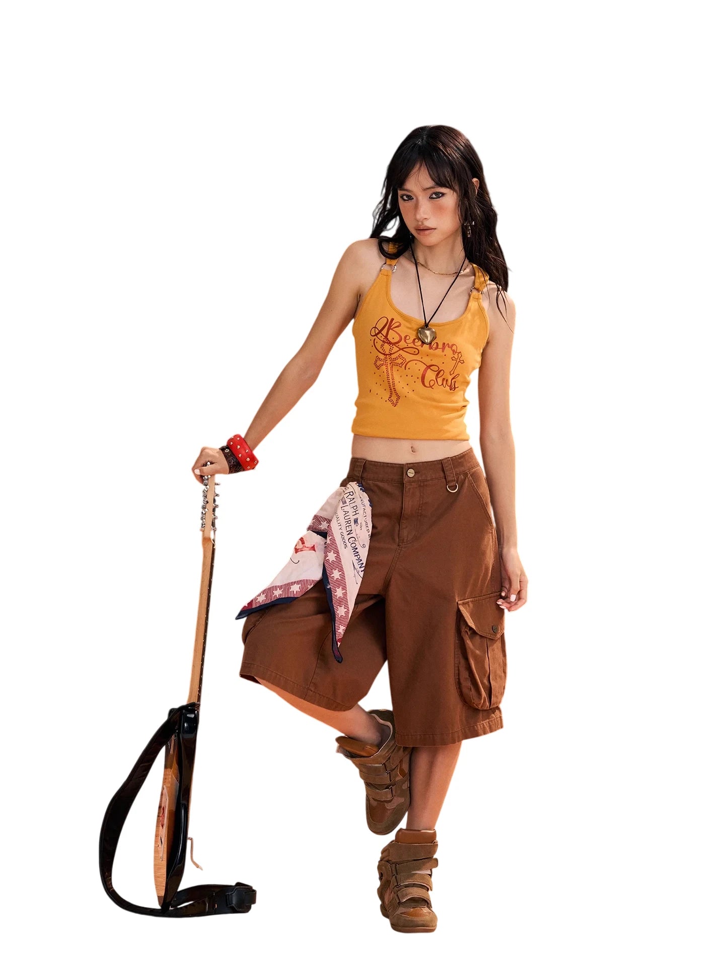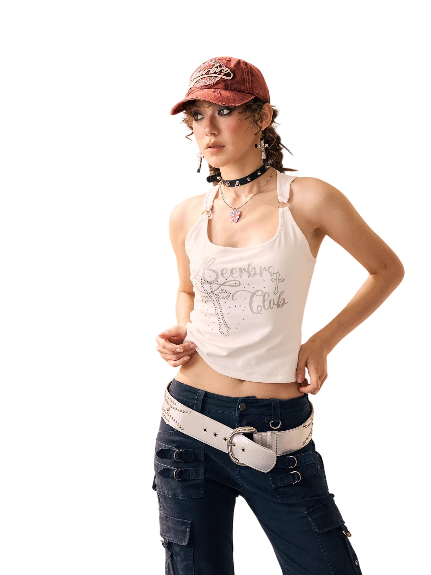 Stay stylish and comfortable this summer with this high-stretch knit tank top, designed for a flattering fit and maximum ease. Featuring a built-in bra pad for added support, it is adorned with rhinestone embellishments and unique strap detailing with ring accents. Perfect for casual outings, the sleeveless crop design offers a trendy and breathable option for warm-weather wear. Ideal for young women seeking a bold yet playful look.