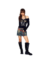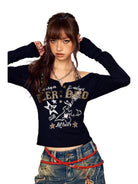 This stylish women's two-piece top features a slim fit design with an off-shoulder long sleeve black outer layer adorned with eye-catching graphics, including typography and star motifs like “HER BEER,” “fabulous,” and “lit·beer.” Decorative buttons line the front for added flair, while the inner layer showcases a distinctive leopard print visible through the wide neckline. Chest pads offer added shape and support, making this top both fashionable and functional. Perfect for trendy casual wear or statement street style.