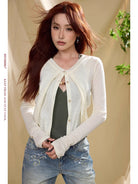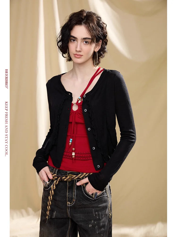 Elevate your casual wardrobe with this lightweight and breathable knit cardigan designed for women. Crafted from a comfortable, skin-friendly wool-blend fabric with 50% wool content, this long-sleeved, button-up cardigan features a sheer texture for a chic layered appearance. Styled over a contrasting inner top for a trendy two-piece look, it's ideal for creating effortless, relaxed outfits. Perfect for transitional weather, pair it with denim for a fresh, modern ensemble.