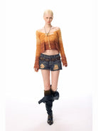 This stylish women's knitwear set features a multicolor metallic gradient design in earthy tones of green, brown, and burgundy. The ensemble includes an open-front openwork cardigan, a halter-style brown crop top with a front tie accent, and a coordinating mini skirt with drawstring waist. Matching leg warmers complete the chic and cozy look. Perfect for fashion-forward layering with a handmade crochet-inspired finish.