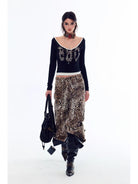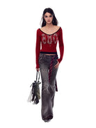 This women's off-shoulder knit top features a stylish faux two-piece design with contrast layering at the neckline and hem. Embellished with metallic sequins near the neckline and bold graphic lettering across the chest, it combines edgy fashion with contemporary flair. Perfect for pairing with statement bottoms for a modern, trend-forward look.