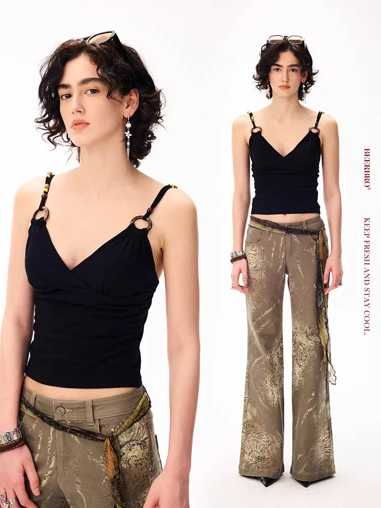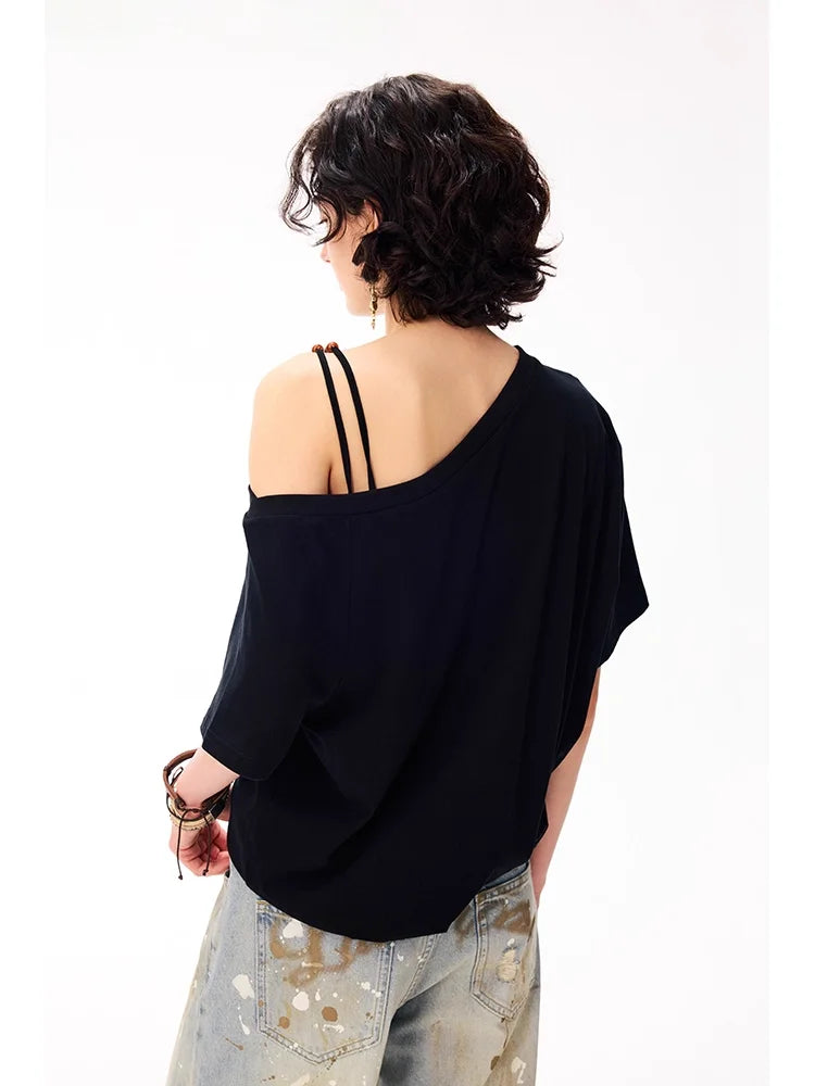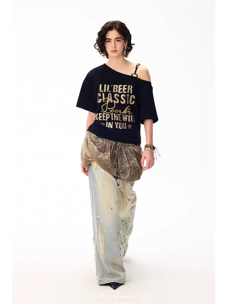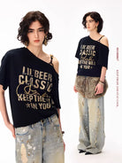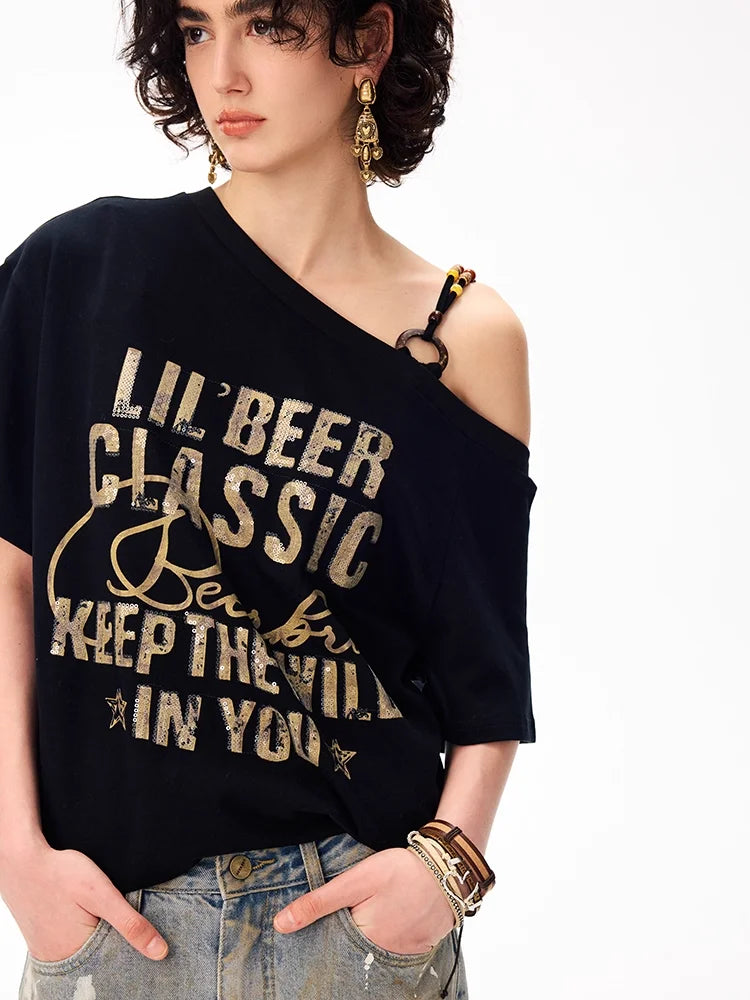 This women's off-shoulder T-shirt features a bold metallic gold graphic that adds an edgy, statement-making touch. Designed with an asymmetrical neckline, it includes a single shoulder strap accented with metallic details for added flair. The T-shirt is crafted from a breathable lyocell-cotton blend, ensuring comfort and a flattering fit. Paired perfectly with distressed jeans for a modern, urban look, this top offers both street-style edge and casual elegance.