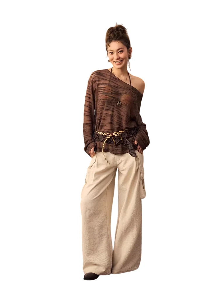 This women's lightweight, semi-sheer knit cover-up features a soft off-shoulder neckline for a relaxed, effortless look. With its textured horizontal stripe pattern and breathable design, it's perfect for layering over summer outfits. Styled with a woven belt for added shape, it's both comfortable and stylish. Ideal for creating a cozy yet chic ensemble.